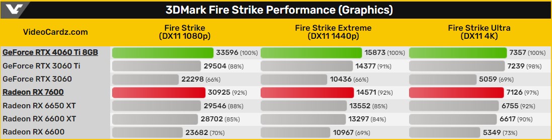 มาดูกันที่ FireStrike (RX 7600 ให้ประสิทธิภาพ 92% ถึง 97% ของ RTX 4060 Ti)