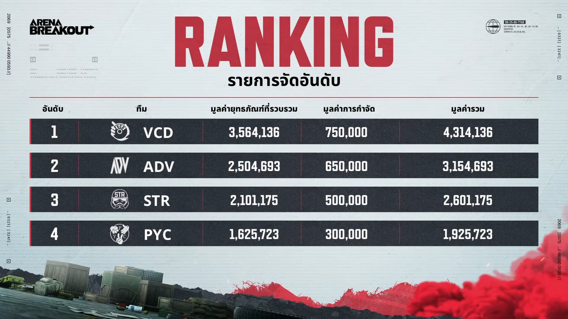 การแข่งขันโชว์แมตช์นี้ ทั้ง 5 เกมของ 4 ทีม ถือว่าสู้กันได้สนุก สุดมันส์ แต่ด้วยตัวเกม Arena Breakout ไม่ใช่ว่ายิงได้แล้วจะชนะ ต้องมีการคิดวางแผน เอาตัวรอดให้เป็น ถึงจะนำยุทธภัณฑ์ออกมาได้ และก็เป็นทีม VCD ที่นำโดย PJY’ Gamer ทำผลงานได้อย่างยอดเยี่ยมจบอันดับที่ 1 ด้วยมูลค่าที่นำออกมามากถึง 4,314,136 คะแนน ส่วน MVP ตกเป็นของ PYM จากทีม ADV