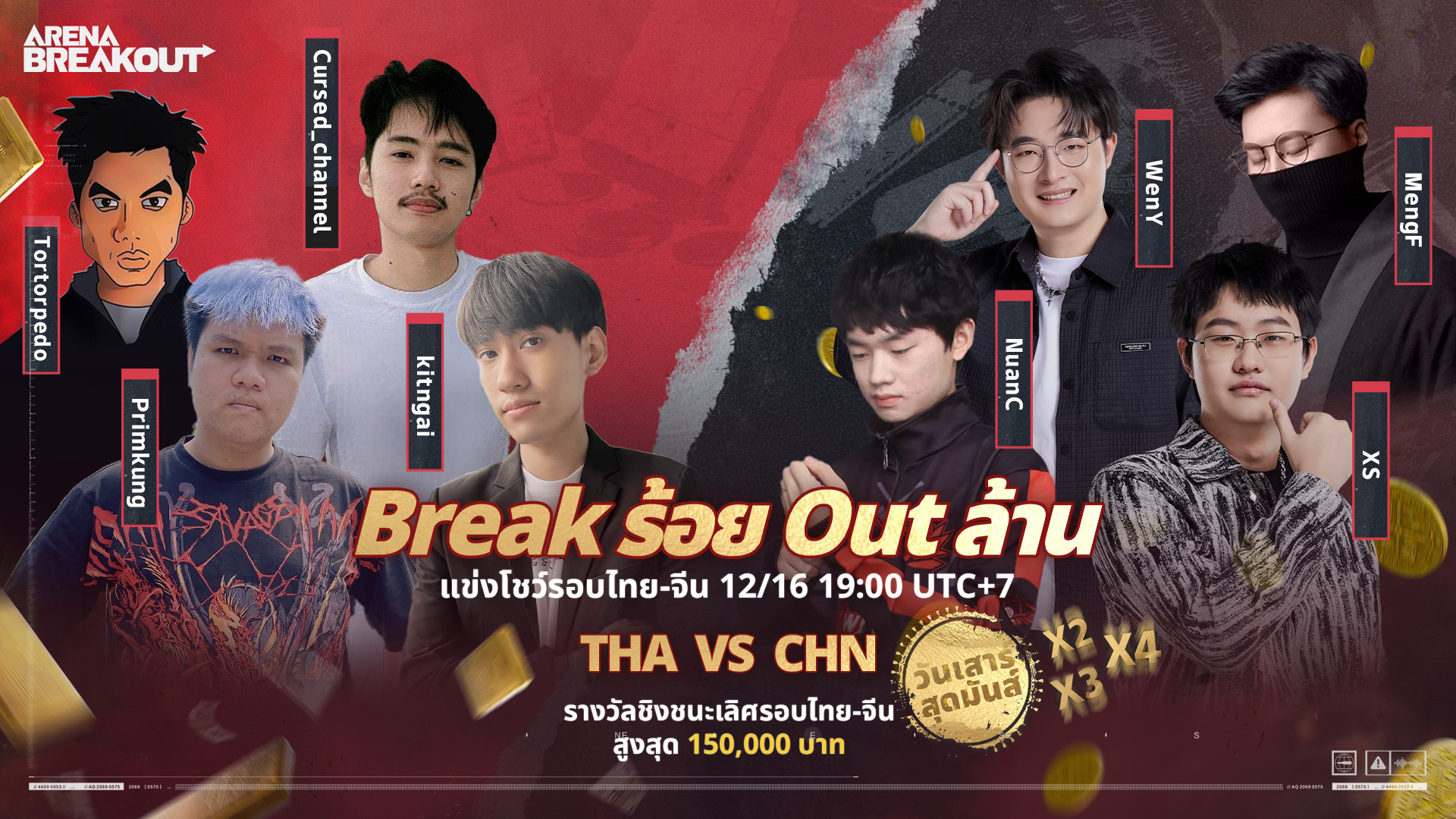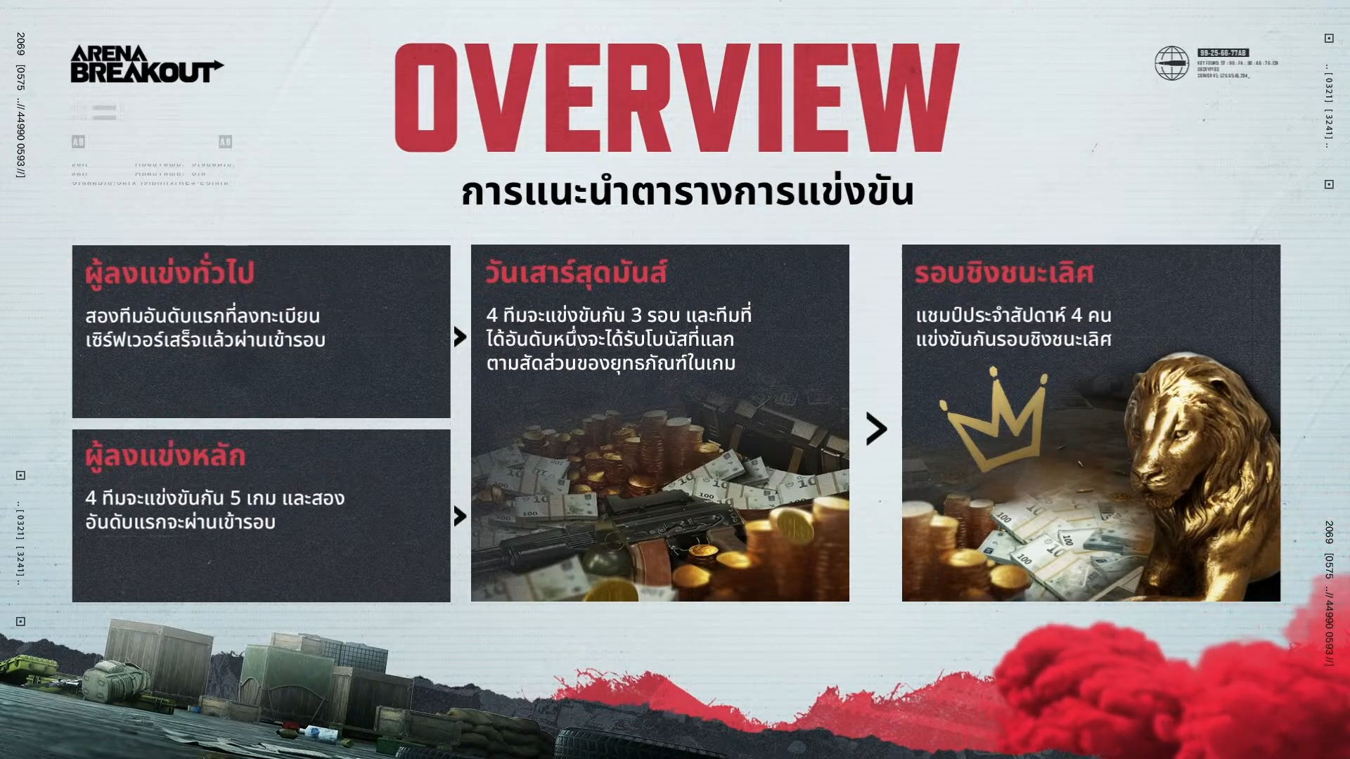 ครั้งแรกของ Arena Breakout เกมแนว FPS กระแสแรงบนมือถือกับการจัดทัวร์นาเมนต์สุดยิ่งใหญ่ Break ร้อย Out ล้าน ชิงเงินรางวัลทุกสัปดาห์ รวมมูลค่ากว่า 1 ล้านบาท พร้อมพบกับอินฟลูเอนเซอร์และสตรีมเมอร์คนดัง โดยเมื่อวันอาทิตย์ที่ 10 ธันวาคมที่ผ่านมาก็ได้เริ่มทัวร์นาเมนต์นี้กันแล้ว เปิดตัวด้วยการโชว์แมตช์ 4 ทีม นำทัพโดย PJY’ Gamer, ChickenV, Bay Riffer และกายหงิด ซึ่งการโชว์ในครั้งนี้มีคนรับชมผ่านช่องทาง YouTube กว่า 4 แสนวิวแล้ว และหลังจากนี้ความสนุกจะยิ่งทวีมากขึ้นเรื่อย ๆ ต้องติดตามกันแบบไม่คลาดสายตา