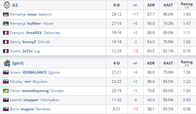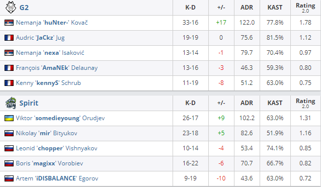โดยในแผนที่ที่สองอย่าง Mirage นั้น Jackz ขอโชว์ผลงานบ้างขึ้นมาจากล่างตารางของเกมก่อนหน้าได้อย่างสวยงาม กดไป 19 Kill ส่วน Hunter เองกดไปถึง 33 Kill ด้วยกันเรียกได้ว่าลั่นต่อเนื่องไม่มีขาดตอน ทำให้ทาง G2 คว้าแชมป์รายการนี้ไปนั่นเอง