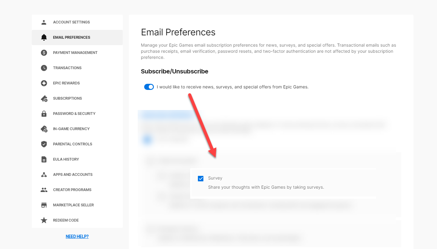 - เลื่อนลงไปล่างสุดที่ตัวเลือก "Survey" กดติ๊กเพื่อเป็นการสมัครรับแบบสอบถามทางอีเมล