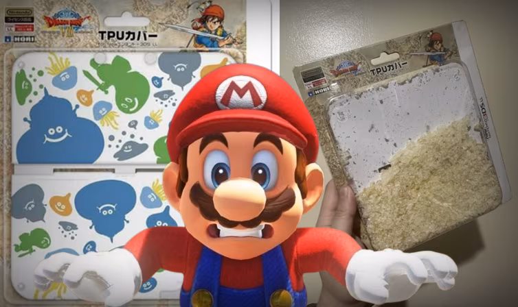 โดยเรื่องราวนี้มาจากทางเว็บไซต์ NintendoSoup กับผู้ใช้ชาวญี่ปุ่นนามว่า Randolph Co ได้ลงรูปโชว์เคสเกม Dragon Quest 8 ของเครื่อง Nintendo 3DS LL ที่เขาเก็บไว้ในกล่องที่ซีลไม่เคยถูกแกะ แต่ทาง Randolph Co ต้องตกใจเมื่อพบว่าเคส Dragon Quest 8 ของเครื่อง Nintendo 3DS LL ที่ถูกเก็บไว้อย่างดีกลับสลายกลายเป็นฝุ่นไปหมดแล้วภายในบรรจุภัณฑ์ ซึ่งเขาได้ภาพถ่ายภาพแสดงให้เห็นว่าบรรจุภัณฑ์ด้านนอกอยู่ในสภาพปกติ แต่ด้านในดูเหมือนเต็มไปด้วยฝุ่นที่เหมือนเศษขนมปัง ซึ่งตัวเคสนี้มันเป็นสีขาวและมีสไลม์สีน้ำเงินเขียวและน้ำตาลกระจายอยู่ทั่ว แต่สีทั้งหมดได้หายไปหมดแล้วเหลือแค่สีน้ำตาลอย่างที่เห็น
