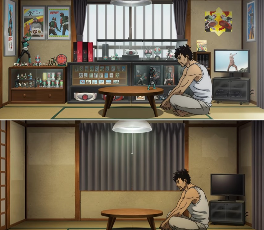 ต่อมาคือเหล่านักเลงที่สวมไอ้โม่งแล้วร้อง กี๊.... ซึ่งใช่มันคือ กี๊ เดียวกับที่เคยเป็นข่าวในตอนนั้น ซึ่งเหล่า กีกี้ พวกนี้คือลูกสมุนของ Shocker ที่มียากูซ่าที่ชอบ Shocker สมัยเด็กโตขึ้นเลยเบียวเป็น Shocker และให้ลูกน้องเป็นกีกี้ออกไปสร้างความวุ่นวาย ลุงโทจิมะที่เห็นแบบนั้นเลยต้องสวมวิญญาณ Kamen Rider ออกไปปราบกีกี้ ซึ่งก่อนหน้านั้นเราจะเห็นภาพตอนเด็กของโทจิมะที่ถูกพ่อทิ้งในงานเทศกาล แต่เพราะ Kamen Rider เด็กชายโทจิมะเลยไม่รู้สึกขาดหรือโหยหาความรักอะไร ที่บอกให้รู้ว่าการ์ตูนก็ช่วยเยียวยาจิตใจได้ เพราะอย่างน้อยมันก็ช่วยให้เด็กชายโทจิมะ ไม่รู้สึกขาดความรักและมีปมที่ถูกพ่อทิ้งได้
