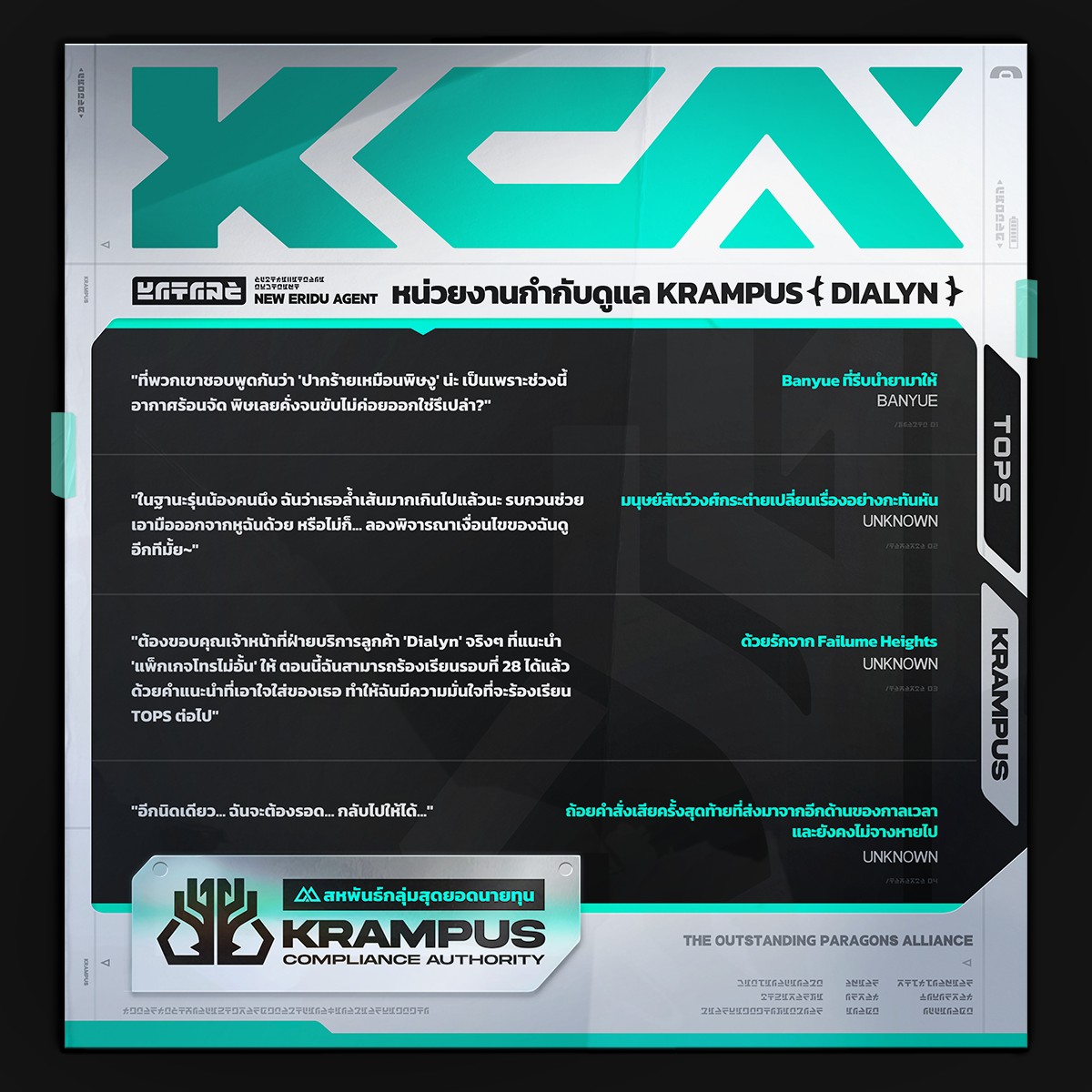 HoYoverse ได้ทำการปล่อย Drip Marketing ตัวละคร Dialyn อย่างเป็นทางการ เป็นตัวละครกายภาพ สายสตั๊น ซึ่งมาจากฝ่ายสหพันธ์กลุ่มสุดยอดนายทุน Krampus ซึ่งเป็นหน่วยเดียวกับ Zhao ที่เราเห็นกันในเนื้อเรื่องหลักเวอร์ชัน 2.3 ไปแล้ว เธอจะมีบทบาทเพิ่มเติมยังไงเราต้องติดตามกันครับ