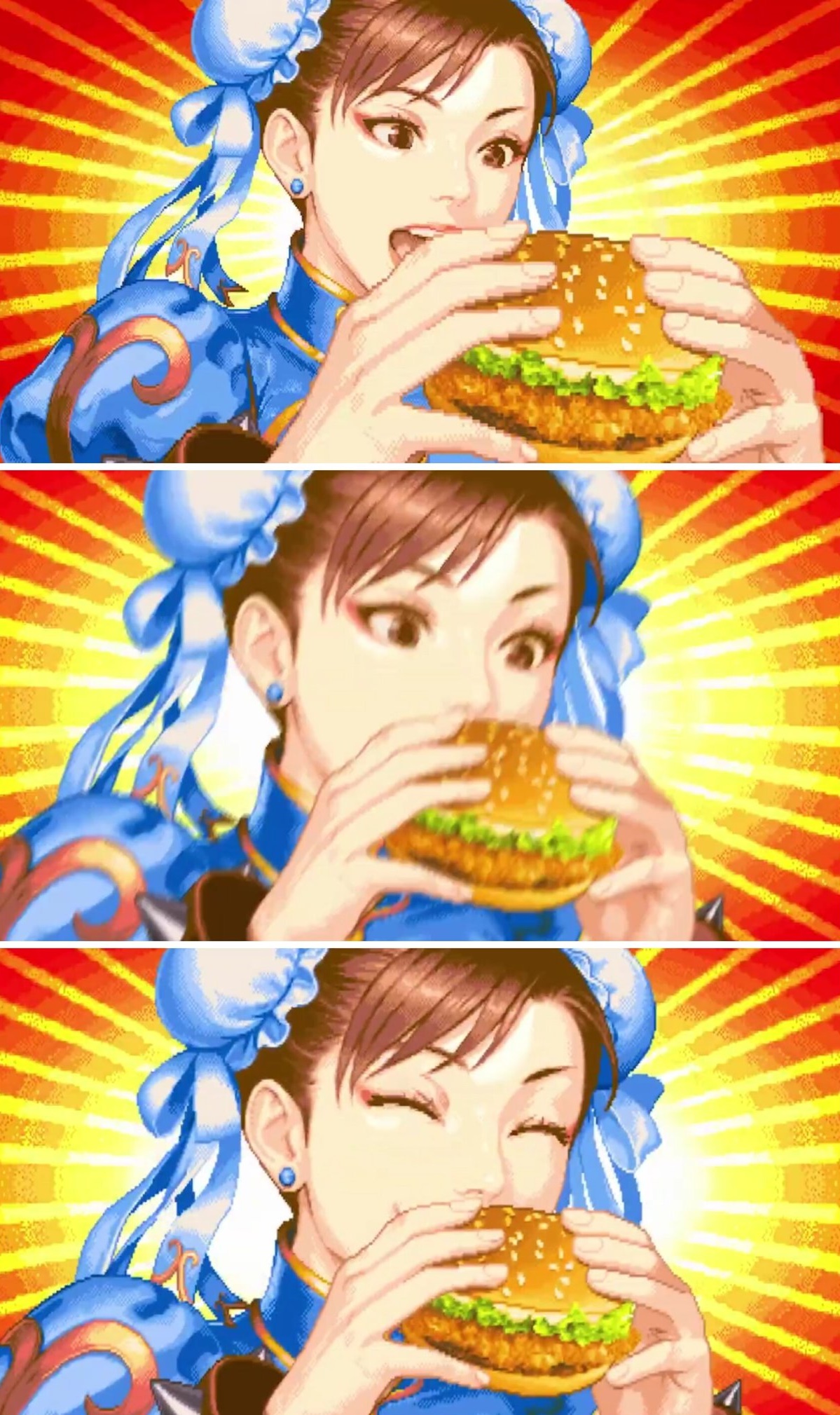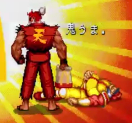Vega (ใครเรียกตัวละครนี้ว่า เวก คุณไม่เด็กแล้ว) ที่โดน Akuma ใช้ท่า Satsui no Hado แต่เปลี่ยนเป็นการยัดเบอร์เกอร์จนพุงกางแทน