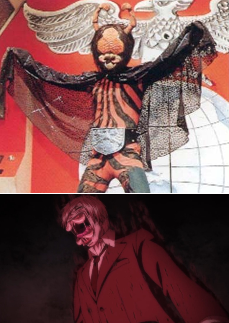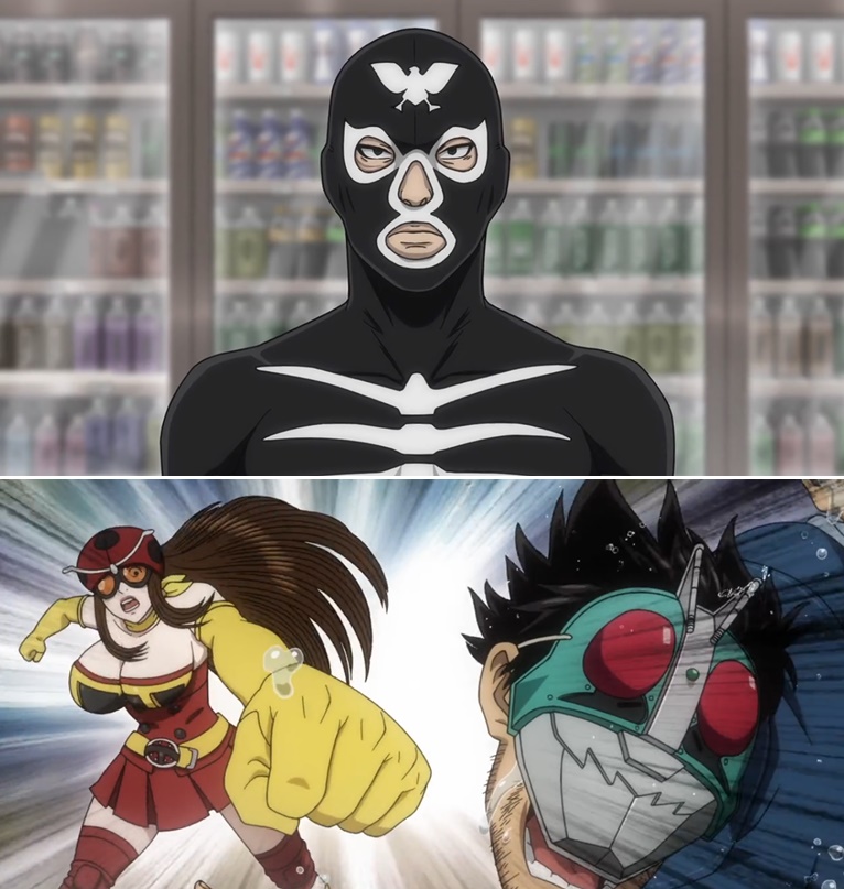 มาต่อกันที่สัตว์ประหลาดที่ปรากฏตัวออกมาฆ่าลูกน้องตัวเอง ใครที่เคยดู ไอ้มดแดง V1 (ขอเรียกแบบนี้เพื่อความเบียวของเหล่ามนุษย์ลุงยุค 90) จะรู้ทันทีว่าชายคนนั้นคือ ปีศาจแมงมุม หรือเรียก มนุษย์ดัดแปลงแมงมุม ขององค์กร Shocker ซึ่งถ้าใครจำได้ไอ้มดแดง V1 ของเราก็ถูก Shocker จับมาดัดแปลงเหมือนกัน เพื่อเป็นมนุษย์ดัดแปลงตั๊กแตน (แต่บ้านเราเรียกมดแดง) แต่ก่อนจะถูกล้างสมอง ฮอนโก ทาเคชิ หรือไอ้มดแดง V1 ได้หนีออกมาได้จากการช่วยเหลือของคนในนั้น และปีศาจแมงมุมคือศัตรูตัวแรกที่ไอ้มดแดงสู้ด้วยในตอนแรกสุด (ปีศาจแมงมุมคงน้อยใจ ตัวเองถูกดัดแปลงโคตรน่าเกลียด แต่ไอ้มดแดงดัดแปลงซะเท่เชียว) และเมื่อเหล่า Shocker ตายไปมันจะกลายเป็นฟองเพื่อไม่ให้เหลือหลักฐานการมีตัวตนขององค์กร