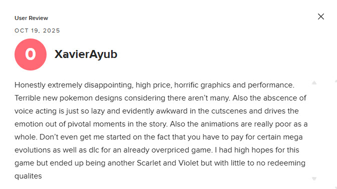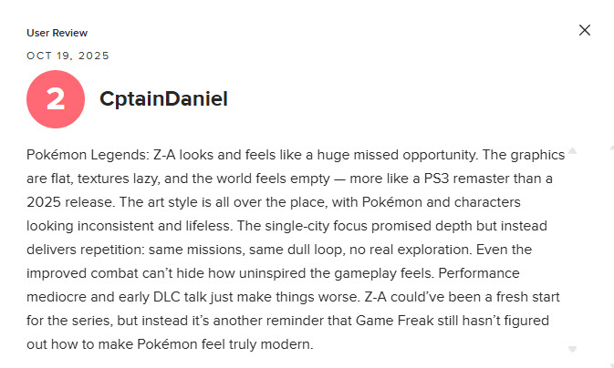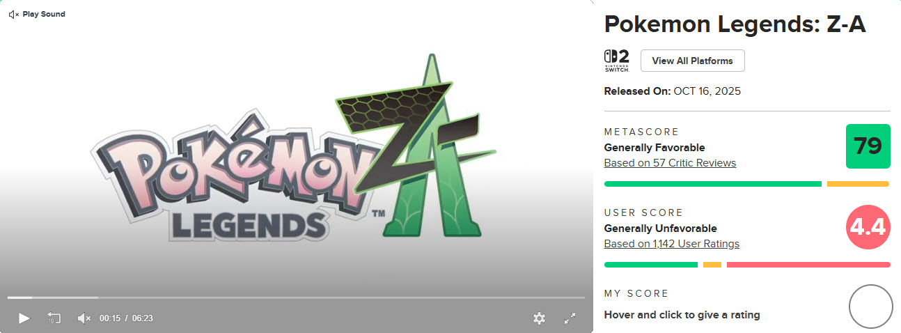 Pokemon Legends: Z-A วางจำหน่ายอย่างเป็นทางการไปแล้วเมื่อวันที่ 16 ตุลาคมที่ผ่านมา แม้ตัวเกมจะเป็นที่พูดในแง่บวกอย่างมากในหมู่แฟนเกมและสื่อหลาย ๆ ช่องทาง แต่ก็ไม่ได้รับคะแนนที่สูงเท่ากับภาค Arceus แต่ก็ดีกว่าภาค Scarlet และ Violet ซึ่งเป็นภาคที่ได้รับคะแนนต่ำที่สุดในซีรีส์ อย่างไรก็ตามตัวเกมกลับถูกบอมบ์รีวิวจากแฟนเกมบางส่วนหลังจากวางจำหน่ายได้ไม่กี่วัน