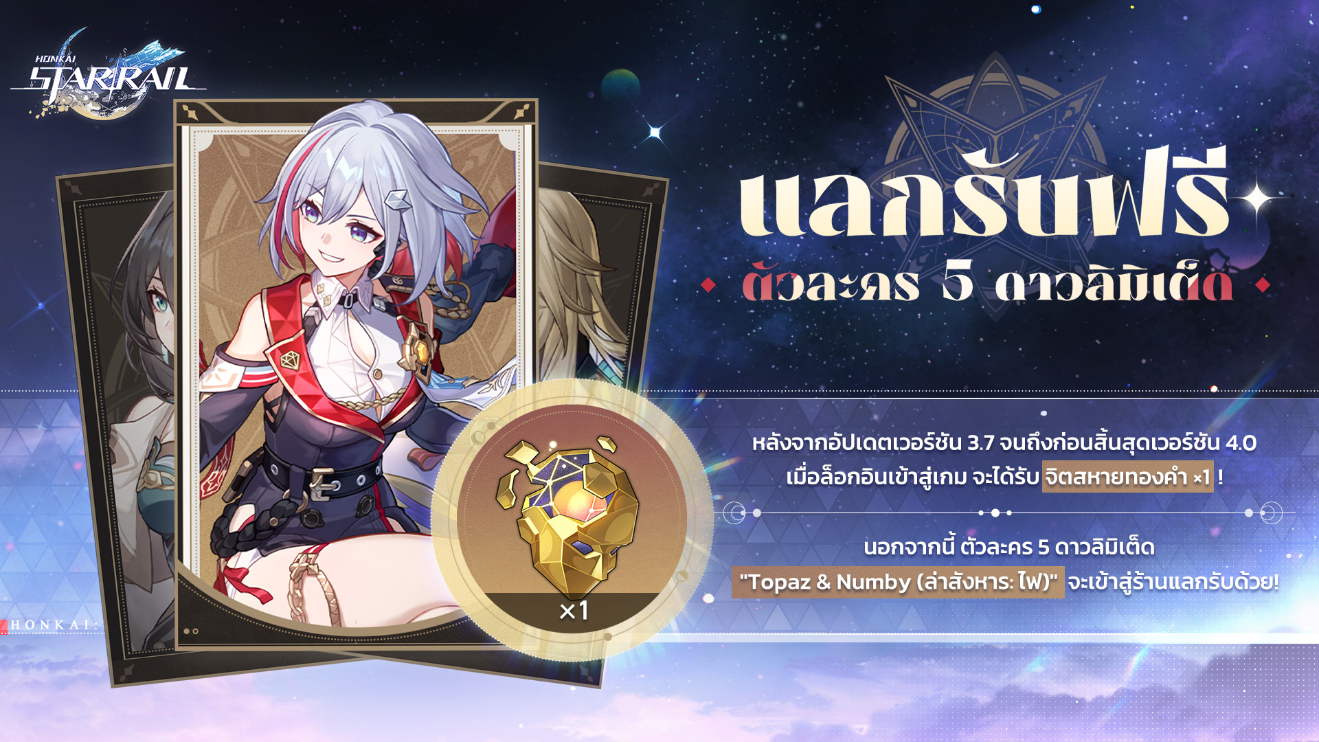 หลังจากอัปเดตเวอร์ชันจนถึงก่อนสิ้นสุดเวอร์ชัน 4.0 หากล็อกอินจะได้รับ จิตสหายทองคำ 1 อันเพื่อแลกรับตัวละคร 5 ดาวลิมิเต็ดหรือ Light Cone 5 ดาวลิมิเต็ดผ่านร้านค้า "รวมจินผสานดารา" โดยครั้งนี้เพิ่ม Topaz & Numby และ Light Cone ประจำตัวเข้ามาในร้านค้าด้วย