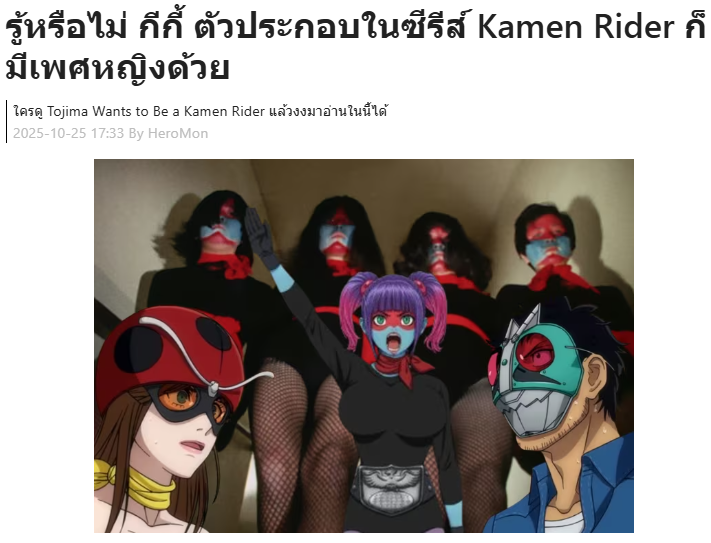 เรียกว่าสนุกน่าติดตามทุกตอนเลยทีเดียว กับอนิเมะรวมคนเบียวบ้าไอ้มดแดง Kamen Rider (ขอเรียกไอ้มดแดงเพื่อเหมาะสมของเนื้อหา) ในซีรีส์ Tojima Wants to Be a Kamen Rider โทจิมะอยากเป็นคาเมนไรเดอร์ ที่เดินทางมาถึงตอนที่ 4 แล้ว โดยในตอนที่แล้วเราจะได้รู้จักกับ กีกี้หญิง หรือจริง ๆ ต้องเรียกว่านักสู้หญิงที่ถ้าใครเคยดูซีรีส์ Kamen Rider ยุคเก่า ๆ น่าจะเคยเห็นมาบ้าง ส่วนใครที่อยากรู้ข้อมูลของกีกี้หญิงแบบเต็ม ๆ เราลงไปแล้วไปย้อนอ่านกันได้ ในส่วนของ Tojima Wants to Be a Kamen Rider ตอนที่ 4 ก็มีข้อมูลน่าสนใจอยู่หลายเรื่อง เรามาดูกันว่าในตอนนี้จะมีข้อมูลอะไรที่คุณควรรู้เกี่ยวกับ Kamen Rider กันบ้างมาดูกัน