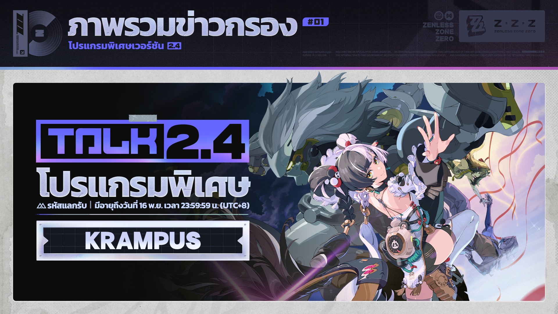 สำหรับไลฟ์พิเศษเวอร์ชัน 2.4 "ห้วงลึกที่กำลังจะมาถึง ครั้งนี้ก็ได้แจก Code พิเศษรับ Polychrome 300 ชิ้น, Denny 30,000, บันทึกนักสำรวจชำนาญการ 2 ชิ้น และ W-Engine Energy Module 3 ชิ้น เช่นเดิม โดยเพื่อนๆสามารถนำโค้ดด้านล่างเติมโดยเข้าเกมแล้วกด ESC - เพิ่มเติม - รหัสแลกรับ หรือสามารถกดลิ้งก์ที่นี่ได้เลย รีบเติมก่อนโค้ดจะหมดอายุวันที่ 16 พฤศจิกายน 22:59 น. ตามเวลาประเทศไทย ขอให้เพื่อนๆโชคดีในการเปิดกาชาเกม Zenless Zone Zero