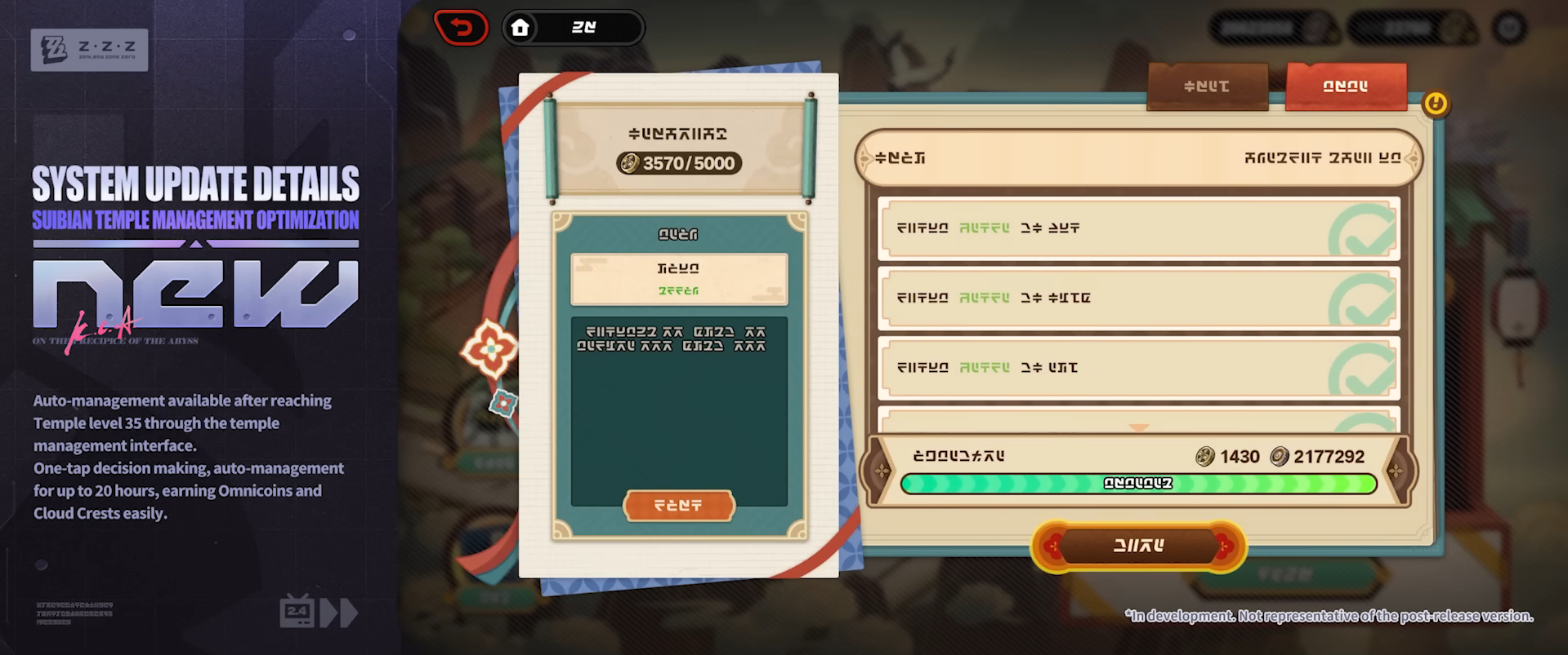 - ปรับปรุงและลดภาระการบริหาร Suibian Temple - เมื่อ Suibian Temple ถึง Lv.35 จะสามารถเปิดใช้งานระบบบริหารอัตโนมัติได้จากทางเข้าของแผนการบริหาร เพียงตัดสินใจภายในปุ่มเดียวก็สามารถบริหารอัตโนมัติได้นานสูงสุด 20 ชั่วโมง และสามารถรับ Omnicoin และ Cloud Crest ได้อย่างง่ายดาย