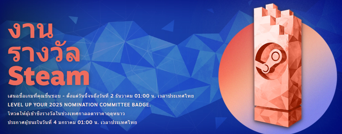 ใครที่สนใจก็เข้าไปร่วมเสนอชื่อเกมที่คุณชื่นชอบได้เลย ตั้งแต่วันนี้จนถึงวันที่ 2 ธันวาคมเวลา 01:00 น. เวลาประเทศไทย และจะประกาศผู้ชนะในวันที่ 4 มกราคม เวลา 01:00 น. เวลาประเทศไทย แค่คุณมีบัญชี Steam และชื่นชอบเกมนั้น ๆ แม้คุณจะเคยเล่นไม่เคยเล่นหรือแค่ดูคนอื่นเล่น แล้วคุณคิดว่าเกมนั้นสนุกก็ไปร่วมโหวตกันได้เลย เราแปะลิงค์เอาไว้ข้างล่างแล้ว และมารอดูกันว่าเกมไหนจะได้รางวัล Steam Awards 2025 นี้ไปมารอลุ้นกัน