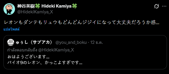 ขนาดเฮียโล้น ฮิเดกิ คามิยะ ผู้กำกับเกม Resident Evil 2 ก็พูดเรื่องราวนี้บน X ที่พี่แกแชร์ทวีตของ ゅぅし(サブアカ)ที่บอกว่า "สวัสดีตอนเช้า… ลีออนจากเกม Biohazard 9 เท่มาก..." ส่วนเฮียคามิยะบอกว่า "Leon Dante และ Ryu ต่างก็แก่ขึ้นเรื่อย ๆ ผมชักสงสัยแล้วว่านั่นเป็นเรื่องดีหรือเปล่า..." พอเจอป๋าคามิยะพูดมาแบบนี้หลายคนก็เริ่มจะแอบเสียวว่างานนี้ลุง Leon เราจะรอดไหม เพราะล่าสุดมีข่าวว่าลุงแกน่าจะติดเชื้อแถมอาการน่าจะรุนแรงมาก ๆ ด้วย จนหลายคนเดาว่าลุง Leon จะตุยไหม แต่หลายคนต่างก็พูดเป็นเสียงเดียวกันว่ารอดมาตั้งขนาดนี้จะมาตายหรอไม่มีทาง