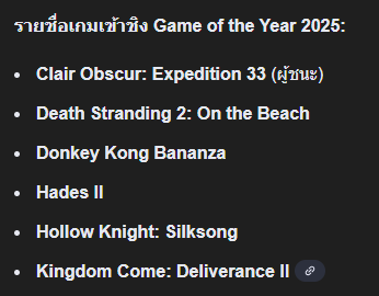 ในส่วนของเกม Kingdom Come Deliverance 2 มียอดขาย 4 ล้านชุดตามหลัง Hollow Knight Silksong ถึง 3 ล้านชุด ต่อมาคือเกมจากฝั่ง Nintendo อย่าง Donkey Kong Bananza มียอดขาย 3.49 ล้านชุด ขณะที่ Hades 2 มียอดขายสองล้านชุด แต่อย่าลืมว่า Donkey Kong Bananza กับ Hades 2 วางจำหน่ายแค่ Nintendo Switch เท่านั้นถ้าสองเกมนี้ไปวางขายที่เครื่องอื่นด้วยยอดคงดีกว่านี้ ขณะที่ Death Stranding 2 ของเรานั้นน่าน้อยใจสุด ๆ เพราะขายได้ 1.3 ล้านชุด ซึ่งนับเป็นเกมที่มียอดขายต่ำกว่าเกมอื่นมากที่สุดใน Game of the Year นี้ (โอ๋ ๆ ตบไหล่นะโคจิมาซัง)