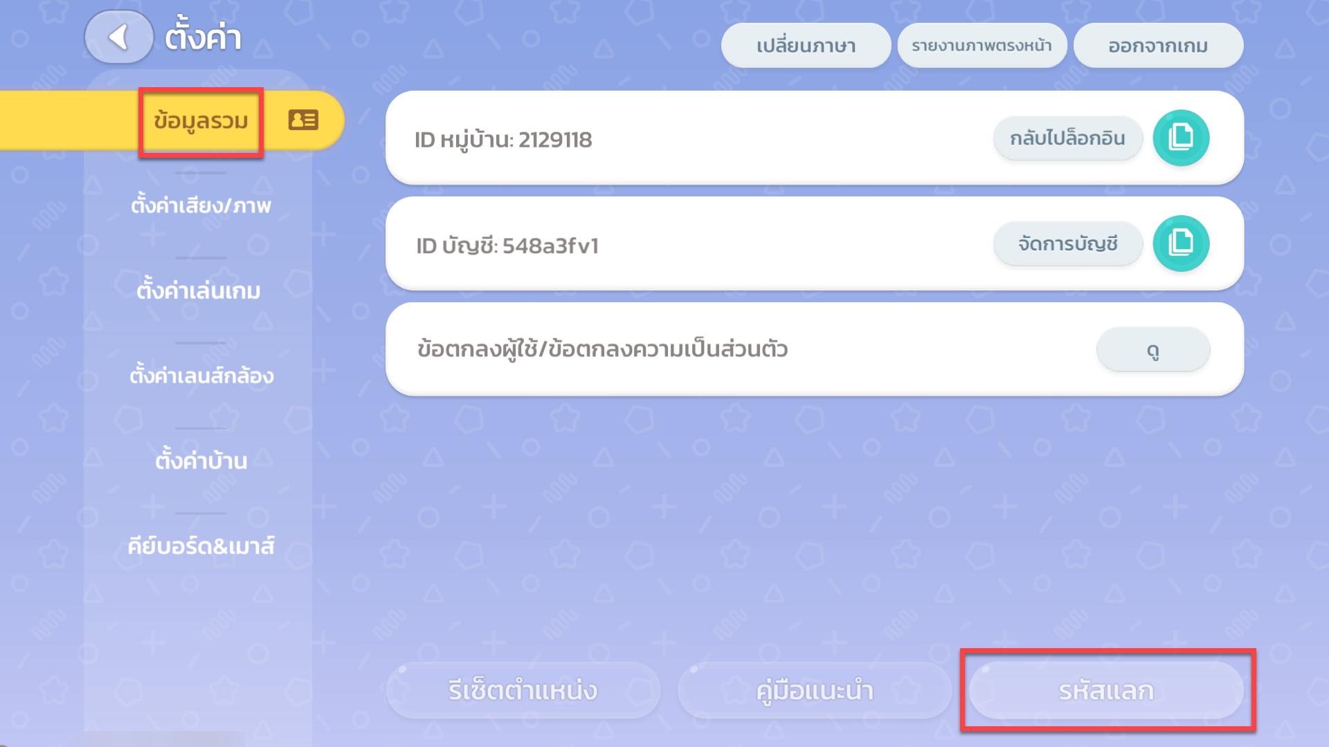 - จากนั้นไปที่เมนู "ข้อมูลรวม" ที่มุมขวาล่างของจอจะมีเมนู "รหัสแลก"