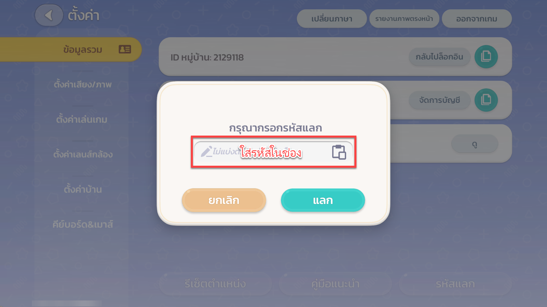 - เมื่อกดเลือก "รหัสแลก" แล้วจะมีหน้าต่างสำหรับกรอกโค้ดขึ้นมา หลังจากกรอกโค้ดแล้วกด "แลก"