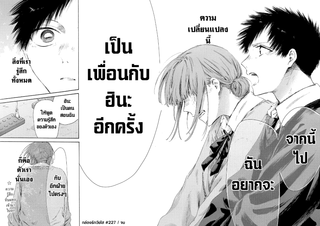 ซี่งก็ต้องรอติดตามกันว่าภายใน ตอนที่ 228 ที่มีชื่อตอนว่า " จากนี้ก็อยากจะ " ของ " กล่องรักวัยใส " หรือ " Ao no Hako " (Blue Box) จะมีการนำเสนอเรื่องราวไปในทิศทางใดต่อไปก็ต้องรอติดตามรับชมกันต่อไป