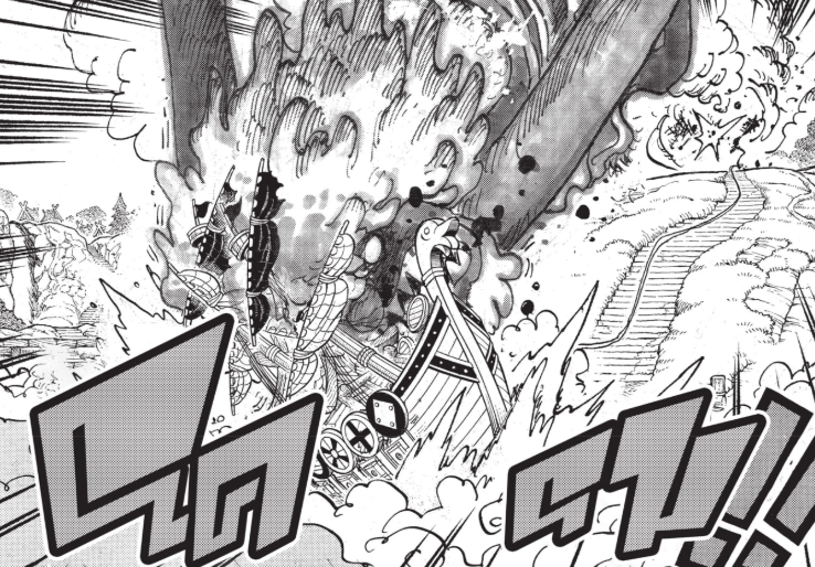 เมื่อทุกคนปลอดภัยลูฟี่กับโลกิในร่างมังกรดำก็พุ่งเข้าหาสัตว์ประหลาดฝันร้าย พร้อมกับเสียงกลองที่ดังกระหึ่มไปทั่วทั้งเอลบาฟ จนเหล่ายักษ์ที่กำลังต่อสู้ต่างตกใจกับสิ่งที่เกิดขึ้น พร้อมกับร่างมังกรดำและลูฟี่ในร่างเกียร์ 5 กำลังลอยอยู่บนฟ้า ขณะที่ซอมเมอร์สโกรธจัดเมื่อเห็นว่าทุกอย่างไม่เป็นตามที่หวัง ส่วนท่านอิมในร่างกุนโกะก็ยืนมองสิ่งที่เกิดขึ้นอย่างเงียบ ๆ โดยที่ไม่พูดอะไร และในหน้าคู่ท้ายตอนเราได้เห็นโลกิในร่างมังกรดำกำลังใช้พลังจากผลปีศาจ ทำลายสัตว์ประหลาดฝันตรงหน้า โดยมีลูฟี่ร่างยักษ์ (เกียร์ 5) ก็ควงค้อนแร็กเนียร์ยืนอยู่บนเขามังกร