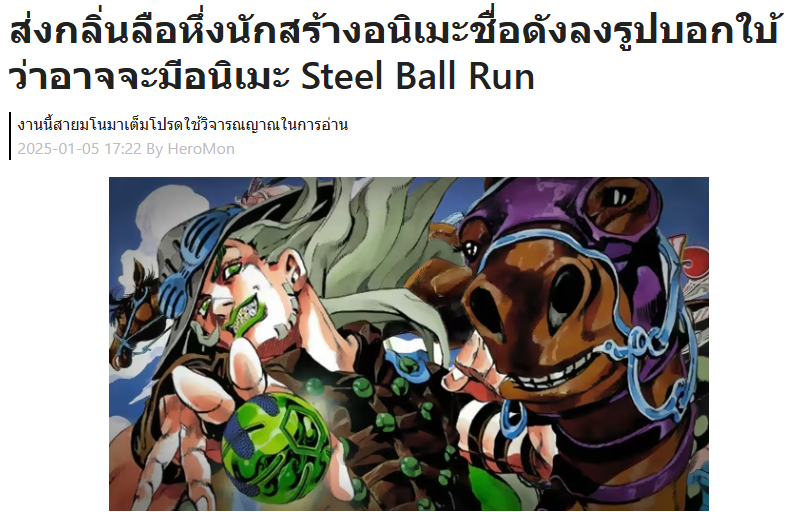 ออกฉายอย่างเป็นทางการไปเป็นที่เรียบร้อยกับอนิเมะที่แฟน ๆ Jojo's Bizarre Adventure หรือ โจโจ้ล่าข้ามศตวรรษ ทั่วโลกรอคอย เพราะถ้าใครที่ติดตามข่าวสารวงการอนิเมะ หรือตามข่าวจากทาง 4Gamers ของเรามา คงจะเคยผ่านตาข่าวลือเกี่ยวกับการสร้างอนิเมะ Jojo's Bizarre Adventure Steel Ball Run ว่ากำลังจะสร้างสร้างอยู่ ไปจนถึงใกล้ฉายออกมาอยู่เรื่อย ๆ จนในที่สุดก็มีการประกาศฉายอย่างเป็นทางการ และปล่อยให้แฟน ๆ ได้ดู และมีแบบพากย์ไทยบน Netflix ที่แค่ตอนแรกตอนเดียวที่ออกฉาย ก็สามารถทำคะแนนอนิเมะยอดนิยมจากคนดูในเว็บไซต์ MyAnimeList ขึ้นอันดับที่ 1 ได้เป็นที่เรียบร้อย แซง Sousou no Frieren คำอธิษฐานในวันที่จากลา ซีซัน 1 ไปได้อย่างสวยงามเรามาดูเรื่องราวนี้กัน