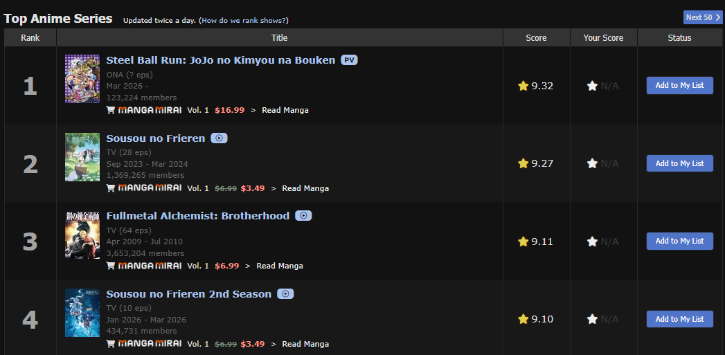 โดยเรื่องราวนี้มาจากเว็บไซต์ MyAnimeList ที่เป็นเว็บไซต์ฐานข้อมูลอนิเมะและมังงะที่ใหญ่ที่สุดและมีอิทธิพลมากที่สุดในโลก ที่จะรวบรวมคะแนนจากแฟน ๆ มาจัดอันดับ โดยหนึ่งในหัวข้อที่หลายคนสนใจก็คือหัวข้อ Top Anime ที่ถ้าใครอยู่วงการอนิเมะมา คงจะทราบดีว่าอนิเมะ Fullmetal Alchemist Brotherhood ติดอันดับที่ 1 มาอย่างยาวนาน ขนาดที่ว่าถ้ามีอนิเมะเรื่องไหนสามารถแซง Fullmetal Alchemist Brotherhood ได้ ก็จะมีแฟน ๆ ช่วยกันโหวตสนับสนุนจน Fullmetal Alchemist Brotherhood ให้ขึ้นที่ 1 เหมือนเดิม แต่สุดท้าย Fullmetal Alchemist Brotherhood ก็โดนความแรงของ Sousou no Frieren คำอธิษฐานในวันที่จากลา ซีซัน 1 แซงไปแบบขาดลอย จนถึงตอนนี้ Jojo's Bizarre Adventure Steel Ball Run ก็มาแซง Sousou no Frieren คำอธิษฐานในวันที่จากลา ซีซัน 1 ได้ถึง 9.32 คะแนน เลยทีเดียว (ตามรูปด้านล่าง)