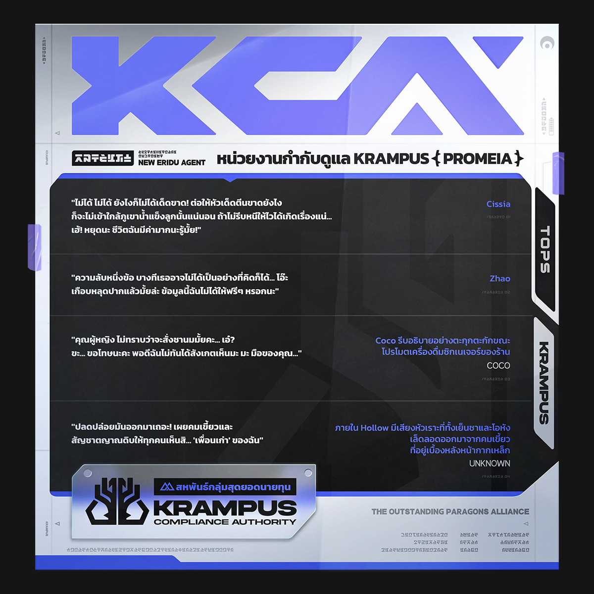 HoYoverse ได้ทำการปล่อย Drip Marketing ตัวละคร Promeia สาวลึกลับจากหน่วยงานกำกับดูแล Krampus อย่างเป็นทางการ มาพร้อมกับธาตุน้ำแข็ง สายธาตุผิดปกติ Promeia จะมาเป็น Agent ให้เราเปิดตู้กาชาหากันในเวอร์ชัน 2.8 นั่นเอง