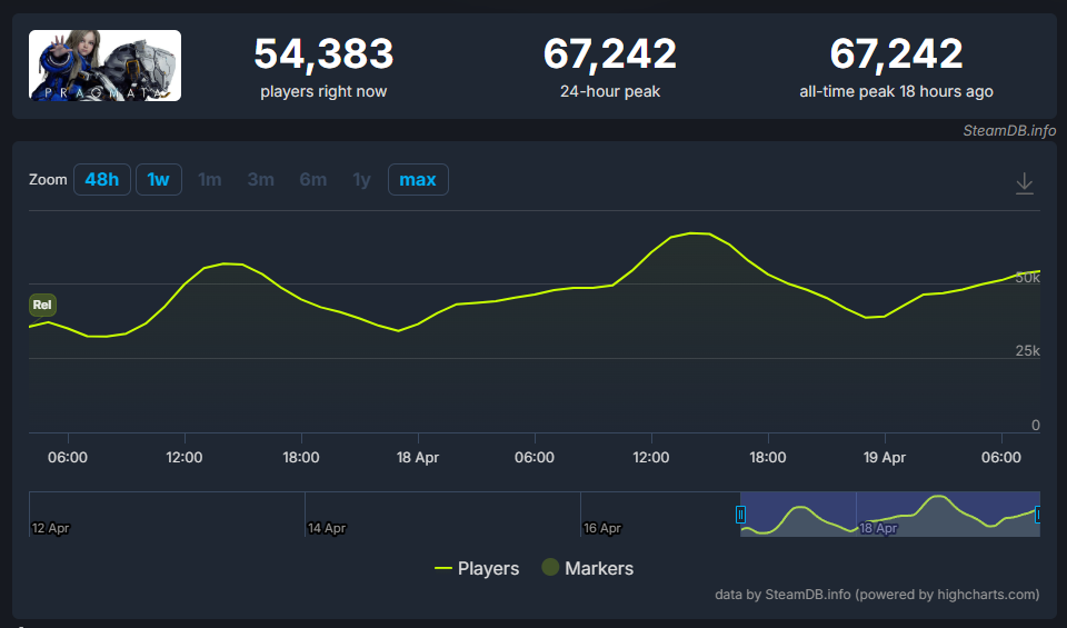 Pragmata แต่เดิมนั้นตัวเกมก็ได้รับความสนใจอย่างมากแล้วนับตั้งแต่เปิดตัว ด้วยแนวทางการเล่นที่แหวกแนวไม่เหมือนใคร และเรื่องราวที่น่าสนใจอย่างมาก เมื่อวางจำหน่ายก็ทำยอดขายขึ้นมาเป็นอันดับหนึ่งบน Steam และมียอดจำนวนผู้เล่นพร้อมกันใน 24 ชั่วโมงสูงถึง 67,242 คน จัดว่าเป็นตัวเลขที่ดีมาก สำหรับเกม single player