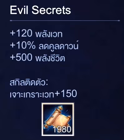 เพราะ Evil Secrets มีความสามารถเจาะเกราะเวทย์ถึง 150 นั่นเองครับ ดังนั้นถ้าเกมไหนคุณเห็นตัวยืนของอีกฝ่ายไม่ออกไอเทมกันเวทย์มาคุณสามารถพลิกแพลงไปออก Evil Secrets ได้ทันทีครับ!