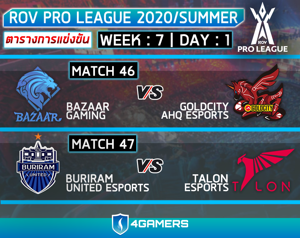 การแข่งขัน RoV Pro League 2020/Summer ตอนนี้ก็ได้เดินทางมาถึงสัปดาห์สุดท้ายของรอบ Group Stage กันแล้วครับ ซึ่งตอนนี้ก็มีทีมที่เข้ารอบแน่นอนแล้ว 2ทีมคือ Buriram United และ Bazaar Gaming ซึ่งทั้ง 2ทีมนี้ก็ต่างมีคิวลงสนามในการแข่งวันแรกของสัปดาห์ที่สุดท้ายทั้งคู่ครับ เอาเป็นว่าเราไปดูตารางการแข่งขันของในวันพรุ่งนี้กันดีกว่าครับ ที่สำคัญคือมีคู่หยุดโลกอย่าง Buriram United ที่ต้องเจอกับ Talon Esports !