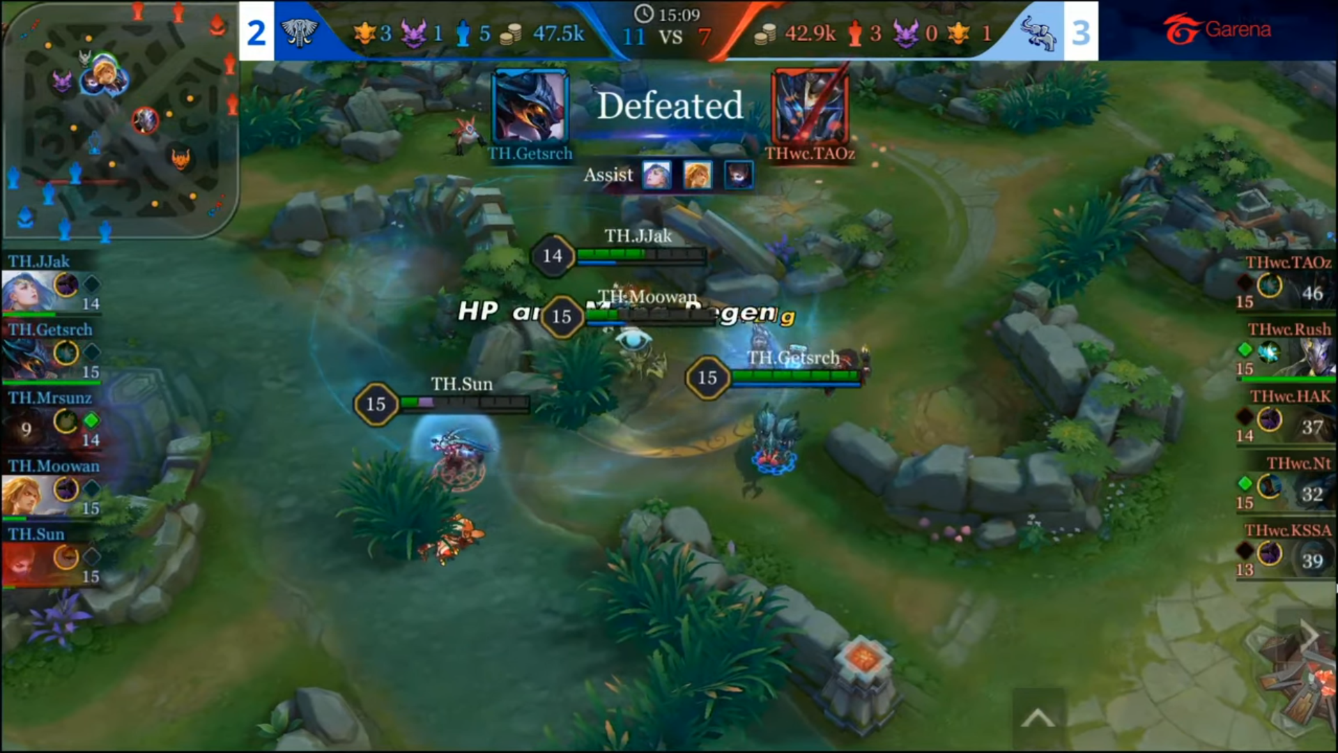 KSSA นั้นรับมือได้อย่างรวดเร็วในจังหวะนี้ โดยลาก Getsrch เข้าไปหาเพื่อนร่วมทีม THwc ของตนเอง ซึ่งก่อนหน้านี้ KSSA ก็ทำแบบนี้หลายต่อหลายครั้ง กับการเล่น Omarr ฮีโร่ที่ไม่อึดแต่มีความคล่องตัวสูง จากการเล่นที่ยอดเยี่ยมของ KSSA ในจังหวะนี้เอง ทำให้ Lindis ของ Rush ที่มีไอเทมเยอะพอสมควรระเบิดความเก่งขึ้นมา เค้าสามารถสังหารฝั่งตรงข้ามไปได้สองคนก่อนตัวเองจะตาย และนั่นก็เพียงพอที่จะทำให้พวกเค้าได้เปรียบในไฟท์ที่ทีมตนเองมีจำนวนมากกว่าตั้งแต่ต้น ต่อเนื่องจากจังหวะนี้ ทีมของเขายังสามารถสังหาร JJak และ Sun ที่พยายามมารับป้อมเลนกลางในตอนหลังได้อีกด้วย