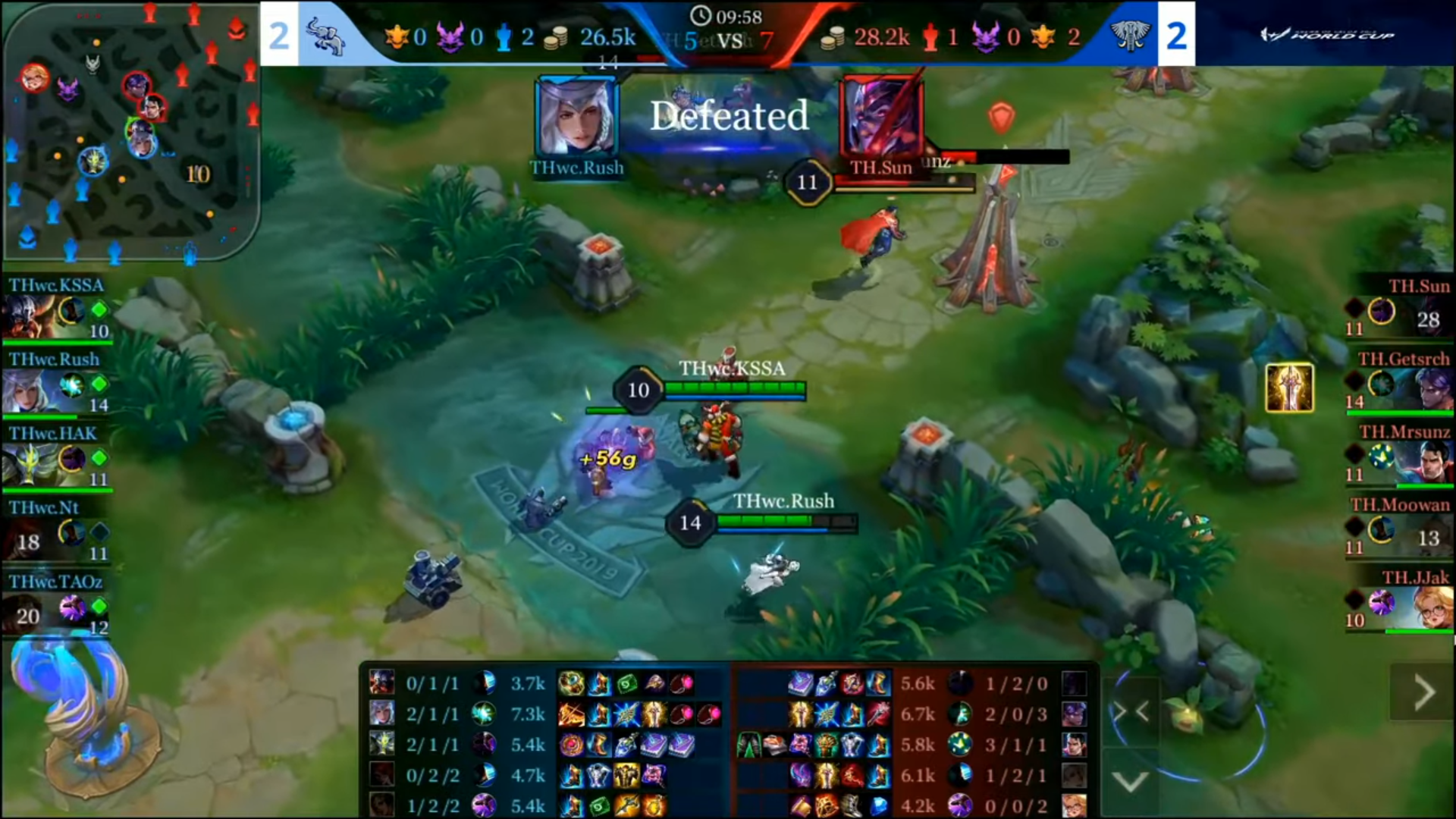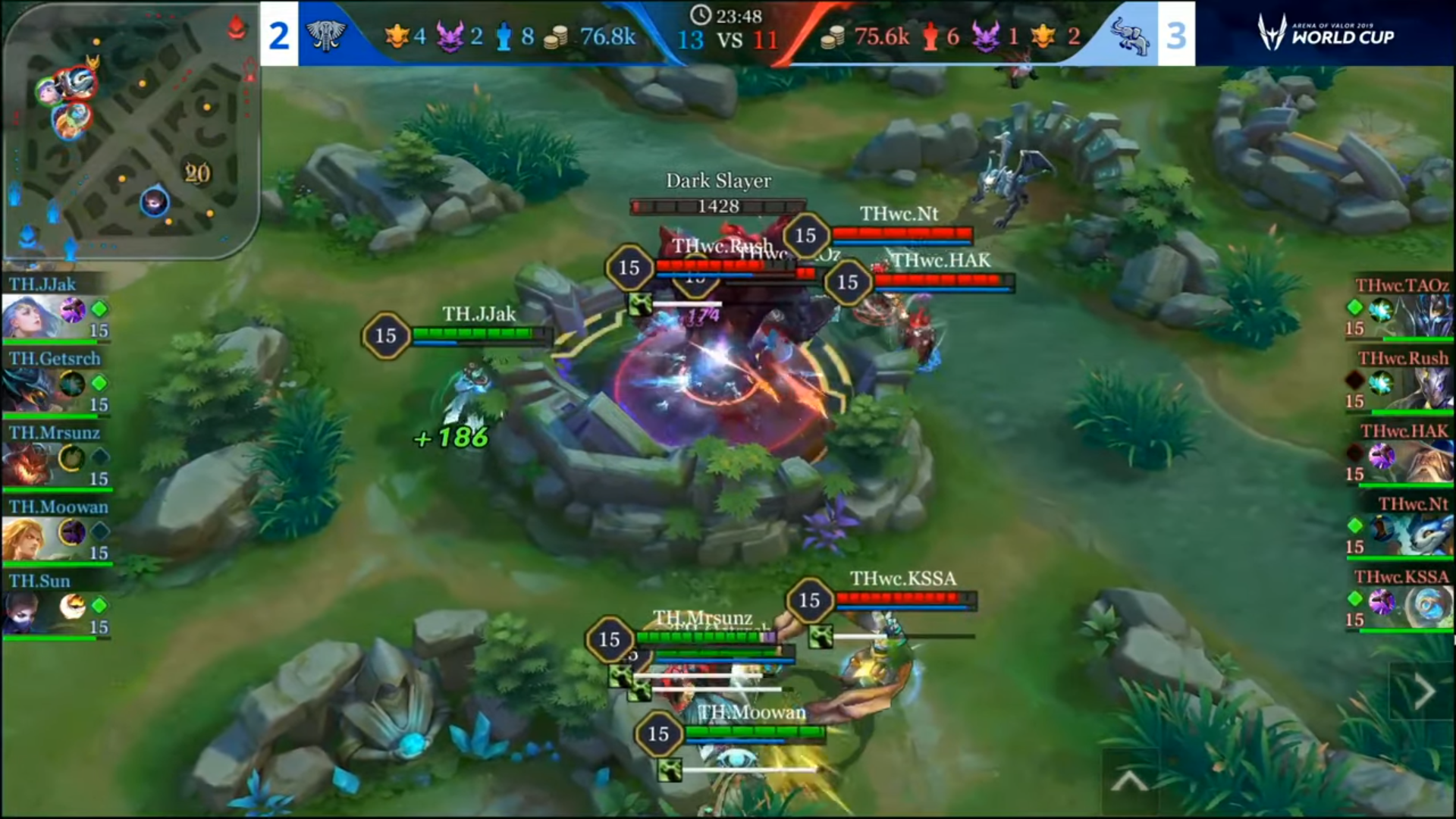 หลังผ่านเหตุการณ์หลักๆ 2 เหตุการณ์ข้างต้น THwc เริ่มเก็บความได้เปรียบคืนมาเรื่อยๆ ไม่ว่าจะเป็น Tarra ที่คอยเคลียร์ครีปในเลนต่างๆอย่างสม่ำเสมอ รวมถึง Ignis และ Nt ที่มีดาเมจเพียงพอจะสังหารตัวยืนตัวสำคัญของทีมไทยแลนด์อย่าง Maloch ได้ จนมาถึงเหตุการณ์สุดท้ายที่สำคัญที่สุด นั่นคือการที่ JJak ออกตัวไปก่อนเพื่อแย่ง Dark Slayer พร้อมกับเพื่อนร่วมทีมอีก 3 คนที่กำลังตามไป แต่ในจังหวะตัดสินนั้น KSSA ตบหยุดทุกอย่างเอาไว้!! และกลายเป็น Lucky Shot ที่สามารถตบหยุด Shock! ของ Maloch ไว้แบบพอดิบพอดีด้วย