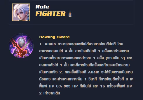 ก่อนอื่นเลยเราต้องมาเข้าใจสกิลของ Allain กันก่อน ซึ่งสิ่งที่เราควรรู้เป็นอย่าแรกเลยก็คือการใช้ Passive ของมัน และ สกิล 1 อย่างไรให้ถูกวิธี เพราะ Passive ของ Allain นั้นส่งผลต่อการแสดงผลของสกิล 1 แบบเต็มๆ ครับ โดย Allain จะมี 2ความสามารถ ใน 1 Passive ซึ่งเจ้า Passive นี้จะทำให้ Allain กลายเป็นฮีโร่ที่มีความสามารถโจมตีได้รวดเร็วที่สุดในเกม