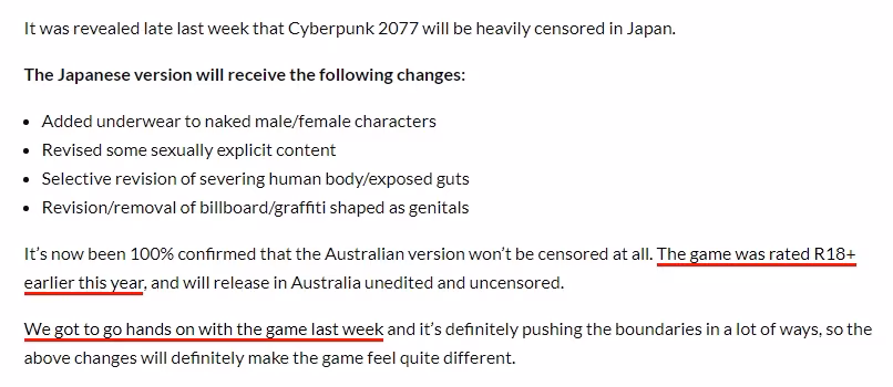 เมื่อเช้านี้ มีการรายงานจากเว็บไซต์ Press-Start สื่อเกมจากประเทศออสเตรเลียเปิดเผยออกมาว่า เกม Cyberpunk 2077 ที่วางขายในประเทศออสเตรเลียจะถูกจัดเรทเป็น 18+ และไม่ถูกเซ็นเซอร์ใดๆ ก่อนวางขาย โดยที่การลงข่าวครั้งนี้มีการพาดพิงถึงเวอร์ชั่นญี่ปุ่นด้วย ว่าเกมที่จะวางขายในประเทศนี้จะมีการเซ็นเซอร์หลากหลายรูปแบบ และมีผลกับเกมอย่างมากทีเดียว