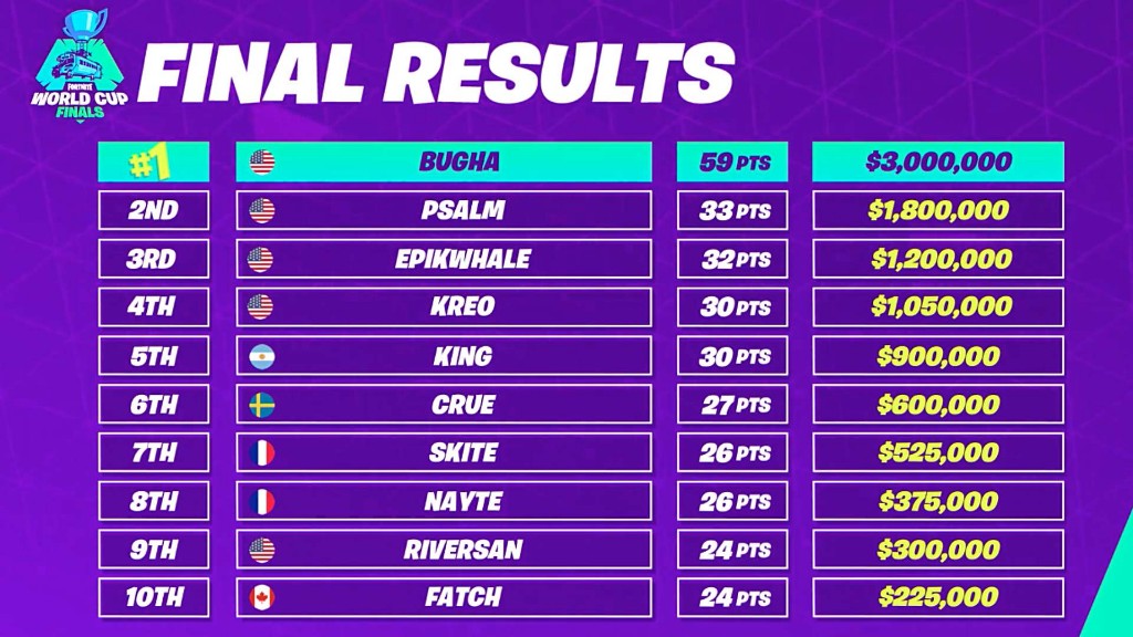 โดยผลสรุปสุดท้าย Bugha มี 59 แต้มห่างจาก อันดับที่ 2 อย่าง Pslam ถึง 26 แต้มเรียกได้ว่าเขาคือผู้เล่น Solo ที่เก่งที่สุดอย่างแท้จริงด้วยคะแนนที่ห่างจนไม่มีใครตามทันได้ !!
