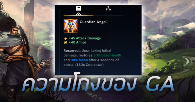 โดยไอเทมที่ว่านั่นก็คือ Guardian Angle หรือที่เรียกกันติดปากย่อๆ ว่า GA นั่นเอง (โดยทาง Riot Games ก็พึ่งได้ออกมาประกาศว่าพวกเขาจะเตรียมเนิร์ฟเจ้าไอเทมนี้ในอนาคต) แต่ว่าก่อนที่มันจะโดนเนิร์ฟเรามาดูเหตุผลความโกงของเจ้า Guardian Angle กันดีกว่าว่ามันดีขนาดไหนจนทำให้ทั้งนักแข่งและผู้เล่นในแรงค์ระดับสูงต่างเลือกที่จะออกมันเป็นไอเทมชิ้นแรกๆ พร้อมเปลี่ยนชื่อให้มันเสร็จสรรพเป็น League of GA เข้ากับความ OP ของมัน