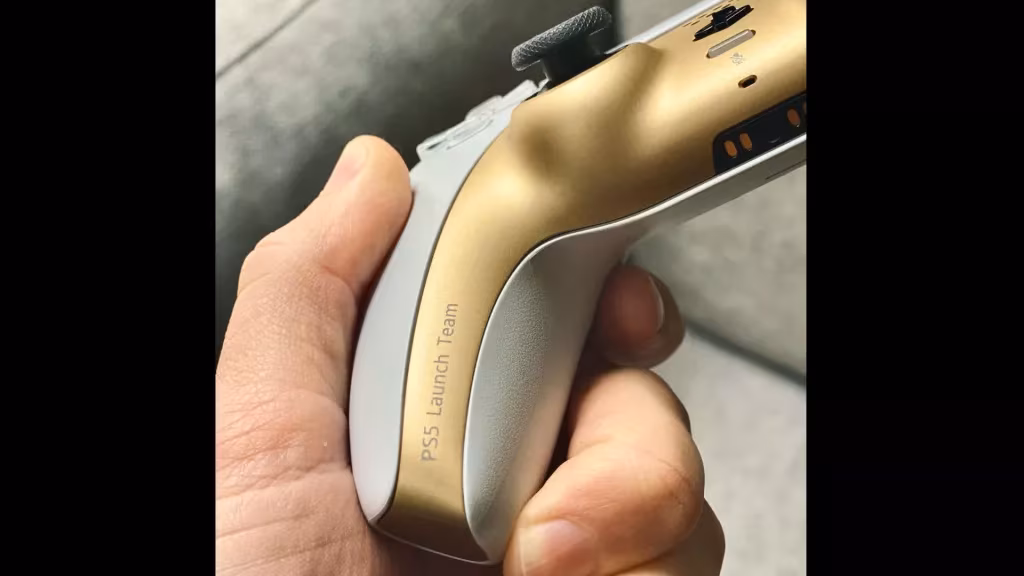 คอนโทรลเลอร์สุดพรีเมี่ยมนี้ออกแบบโดย Joey Rabbitt ผู้จัดการฝ่ายออกแบบผลิตภัณฑ์ของ PlayStation ซึ่งได้เผยโฉมหน้าของคอนโทรลเลอร์แสนพิเศษนี้ผ่านทางเว็บไซต์ LinkedIn โดยได้เปลี่ยนรูปโฉมคอนโทรลเลอร์ที่ปกติเป็นสีขาวดำ ให้กลายเป็น สีขาวทองเมทัลลิกสุดเก๋ไก๋ที่มาพร้อมตัวหนังสือ "PS5 launch team" ซึ่งคอนโทรลเลอร์ตัวนี้ออกแบบมาเพื่อเป็นรางวัลฉลองความสำเร็จให้แก่พนักงานของ Playstation นั่นเอง