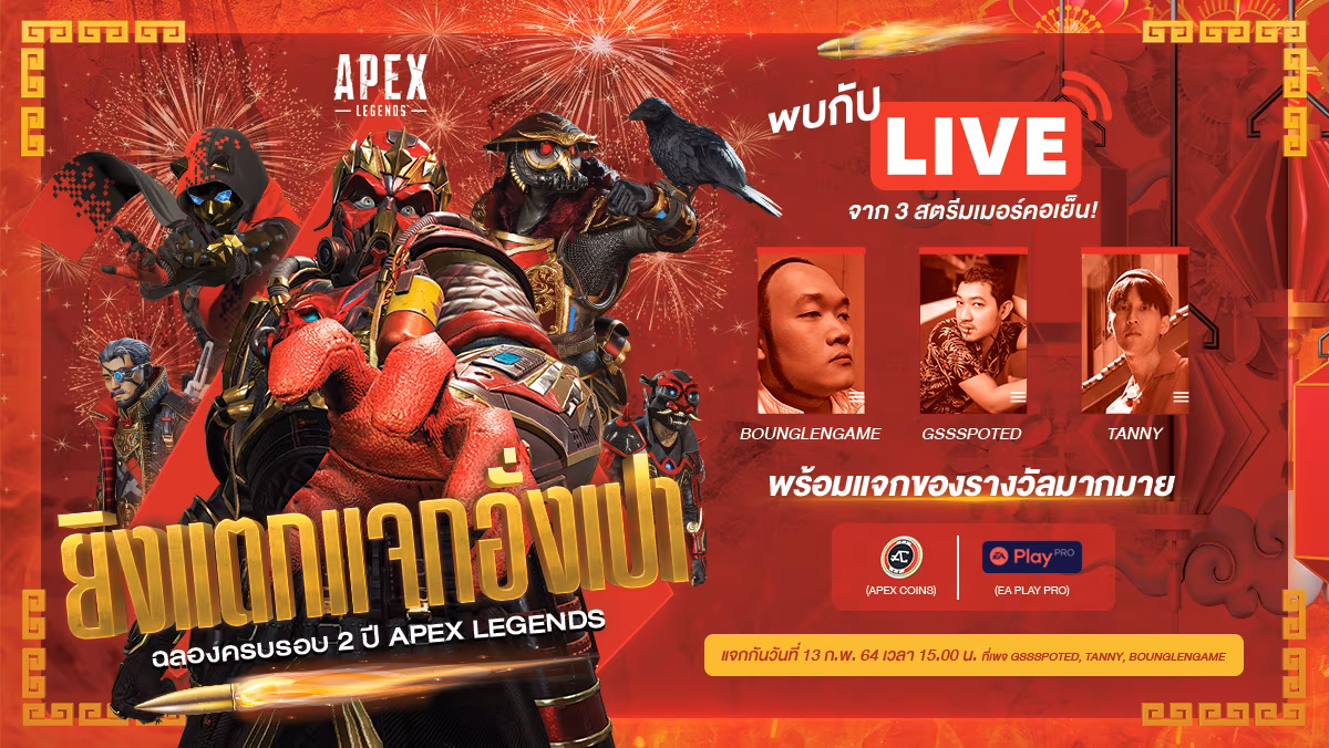 Apex Legends ภูมิใจเสนอกิจกรรม Lunar New Year Event ตลอดเดือนกุมภาพันธ์นี้ ตั้งแต่วันที่ 12 กุมภาพันธ์เป็นต้นไป ผู้เล่นชาวไทยของเราสามารถเข้าไปรับชมไลฟ์สตรีมจากเหล่าสตรีมเมอร์ชื่อดัง หรือเข้าไปร่วมกิจกรรมได้ทางเพจเกมที่ร่วมกิจกรรมเพื่อรับของรางวัลมากมาย ทั้งเหรียญ Apex Coins และสมาชิก 12 เดือนของ EA Play Pro ได้ฟรีๆ!