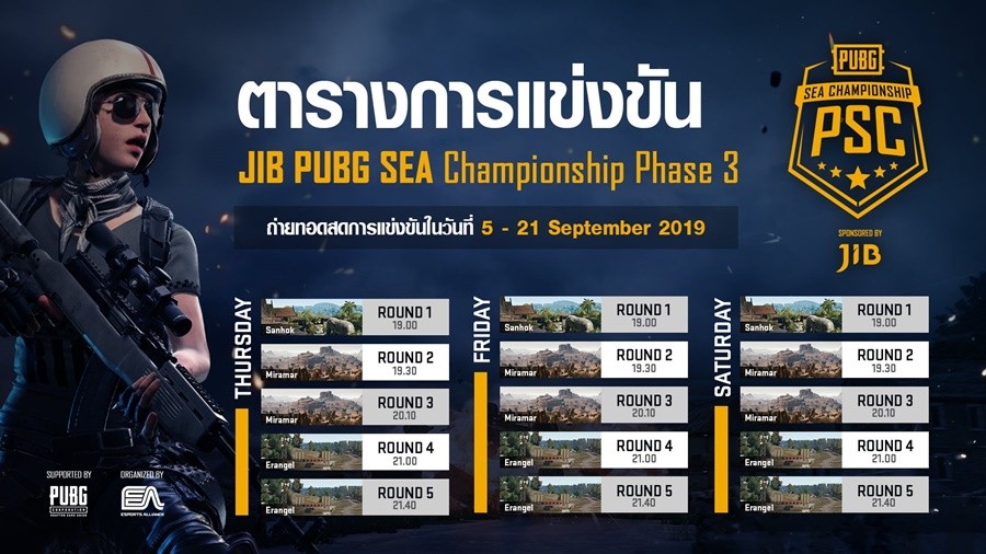 การแข่งขัน JIB PUBG SEA Championship Phase 3 ได้เริ่มต้นขึ้นแล้ว โดยระยะเวลาการแข่งขันจะเริ่มตั้งแต่วันที่ 5 กันยายน - 29 กันยายนเลยทีเดียว เป็นการแข่งขัน เพื่อชิงเงินรางวัลรวมถึง $100,000 ซึ่งการแข่งขันนี้จะมีตำแหน่งแชมป์เปี้ยนของภูมิภาคเอเชียเป็นเดิมพัน ถ้าทีมไหนที่สามารถคว้าแชมป์ในการแข่งขันนี้ไปได้ ก็จะได้รับตั๋วที่นั่งสุดท้าย สำหรับการเดินทางเข้าไปแข่งขัน PUBG ชิงแชมป์โลก หรือ ที่ใช้ชื่อว่า PUBG Global Championship 2019 ไปครอง โดยการแข่งขันจะถูกจัดขึ้นในเดือน 11 ที่ สหรัฐอเมริกา ที่มีเงินรางวัลรวมสูงถึง $2,000,000 เลยทีเดียว !!