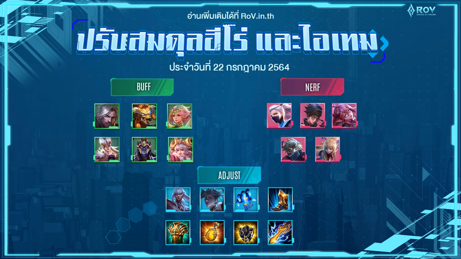 ปัจจุบัน RoV แพทช์ใหม่ 2021 Season 19 นี้ก็ได้เข้าสู่ตัวเกมเป็นที่เรียบร้อยแล้วครับ ซึ่งจากที่ไปลองทดสอบมาต้องบอกว่าพวกตัวเจ้าพ่อเจ้าแม่เมต้าอย่าง Keera, Errol, Aoi และ Airi นั้นโดนเนิร์ฟแบบส่งผลหนักเลยทีเดียว รวมถึงพลังแฝงสุด OP อย่าง Alcheny ก็ถูดลดประสิทธิภาพไปค่อนข้างเยอะเอาการเลยทีเดียว เอาเป็นว่าก่อนเข้าเกม RoV ไปลงแรงค์ยังไงก็ศึกษารายละเอียดการอัปเดตแพทช์ใหม่นี้ก่อนนะครับ เพราะบอกเลยว่าถ้าไม่ได้ศึกษาก่อนเข้าไปอาจจะหลงทางกันได้เลยทีเดียว