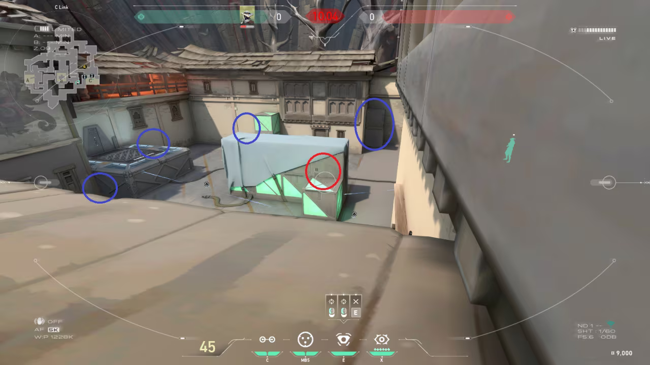 และหลังจากเพื่อน ๆ ทำการกระโดดขึ้นมาบนกล่อง ให้ทำการยืนแถวขอบ ๆ กล่อง แล้วทำการเล็งไว้ในจุดดังภาพ แต่ถ้าต้องการจะเซ็ตก่อนที่เกมจะเริ่ม เพื่อน ๆ อาจจะต้องขยับมุมเข้ามาอีกหน่อย และให้ทำการกระโดดปา ก็จะทำให้สามารถวาง Spycam ได้นั่นเอง