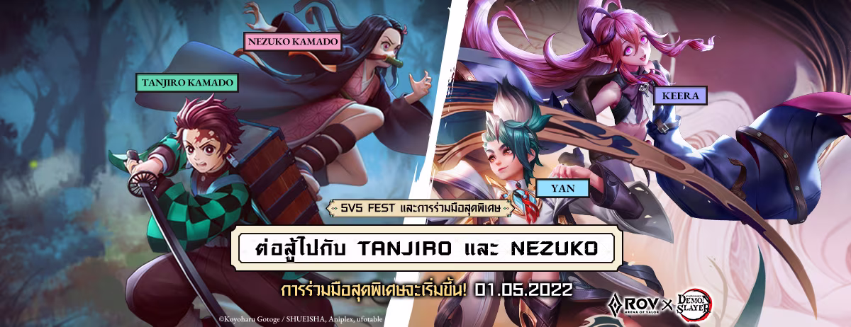 โดยก่อนหน้านี้ก็ได้มีการยืนยันไปแล้วว่าในโปรเจกต์ RoV x Demon Slayer Kimetsu no Yaiba พวกเขาจะนำ 2 ตัวละครหลักจากอนิเมะดาบพิฆาตอสูรอย่างทันจิโร่ Tanjiro และ เนซึโกะ Nezuko เข้าสู่ตัวเกมในฐานะสกินใหม่ RoV ของฮีโร่ Yan และ Keera (อ่านรายละเอียดเพิ่มเติม)