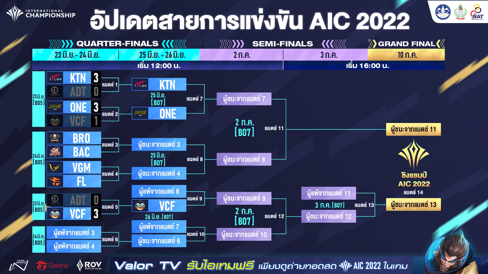 ตอนนี้ผลการแข่งขัน RoV ชิงชิงแชมป์ระดับนานาชาติรายการ AIC 2022 รอบ 8 ทีมสุดท้าย Quarter-Finals วันแรกที่จบลงช่วงดึกของเมื่อวานนี้ก็ได้บทสรุปออกมาแล้ว โดยทีมจากประเทศไทยเราทั้งสองทีมที่มีคิวลงสนามแข่งขันเมื่อวานนี้อย่าง KFX x Talon และ Valencia CF Esports สามารถกอดคอผ่านเข้าสู่รอบถัดไปได้ทั้งคู่