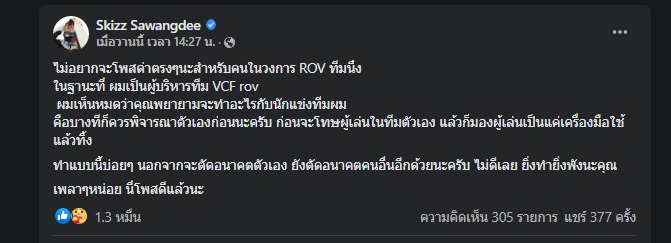 แต่นอกจากมีเรื่องของการแอบติดต่อสมาชิกในทีม Valencia CF Esports แล้ว SkizzTV ยังออกมาพูดถึงพฤติกรรมของบริหาร RoV รายนี้ว่า "บางทีก็ควรพิจารณาตัวเองก่อนนะครับ ก่อนจะโทษผู้เล่นในทีมตัวเอง แล้วก็มองผู้เล่นเป็นแค่เครื่องมือใช้แล้วทิ้ง ทำแบบนี้บ่อยๆ นอกจากจะตัดอนาคตตัวเอง ยังตัดอนาคตคนอื่นอีกด้วยนะครับ ไม่ดีเลย ยิ่งทำยิ่งพังนะคุณ"