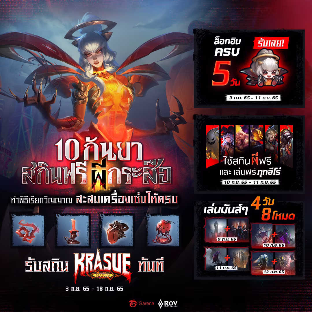 และตอนนี้ตัวกิจกรรมสะสมเครื่องเซ่นเพื่อแลกรับสกิน RoV ฟรี Marja Krasue ก็ได้เริ่มต้นขึ้นแล้วครับ โดยระยะเวลากิจกรรมนั้นจะเริ่มตั้งแต่วันที่ 3 ก.ย. ไปจนถึงวันที่ 11 ก.ย. 2565 หรือถ้านับระยะเวลาตั้งแต่วันนี้ก็เหลืออยู่ 5 วันครับ (บอกเลยว่าเหลือเฟือ) เพราะเหล่าเครื่องเซ่นที่จะต้องใช้ปลุกวิญญาณนั้นหาได้ง่ายมาก ๆ ครับไม่ว่าจะเป็นจากการ Login รายวันหรือแค่เข้าไปเล่นเกมตามปกติทั้งในโหมดธรรมดาหรือจัดอันดับก็จะได้เครื่องเซ่นเพื่อมาทำการอัญเชิญวิญญาณ Marja Krasu ทันที