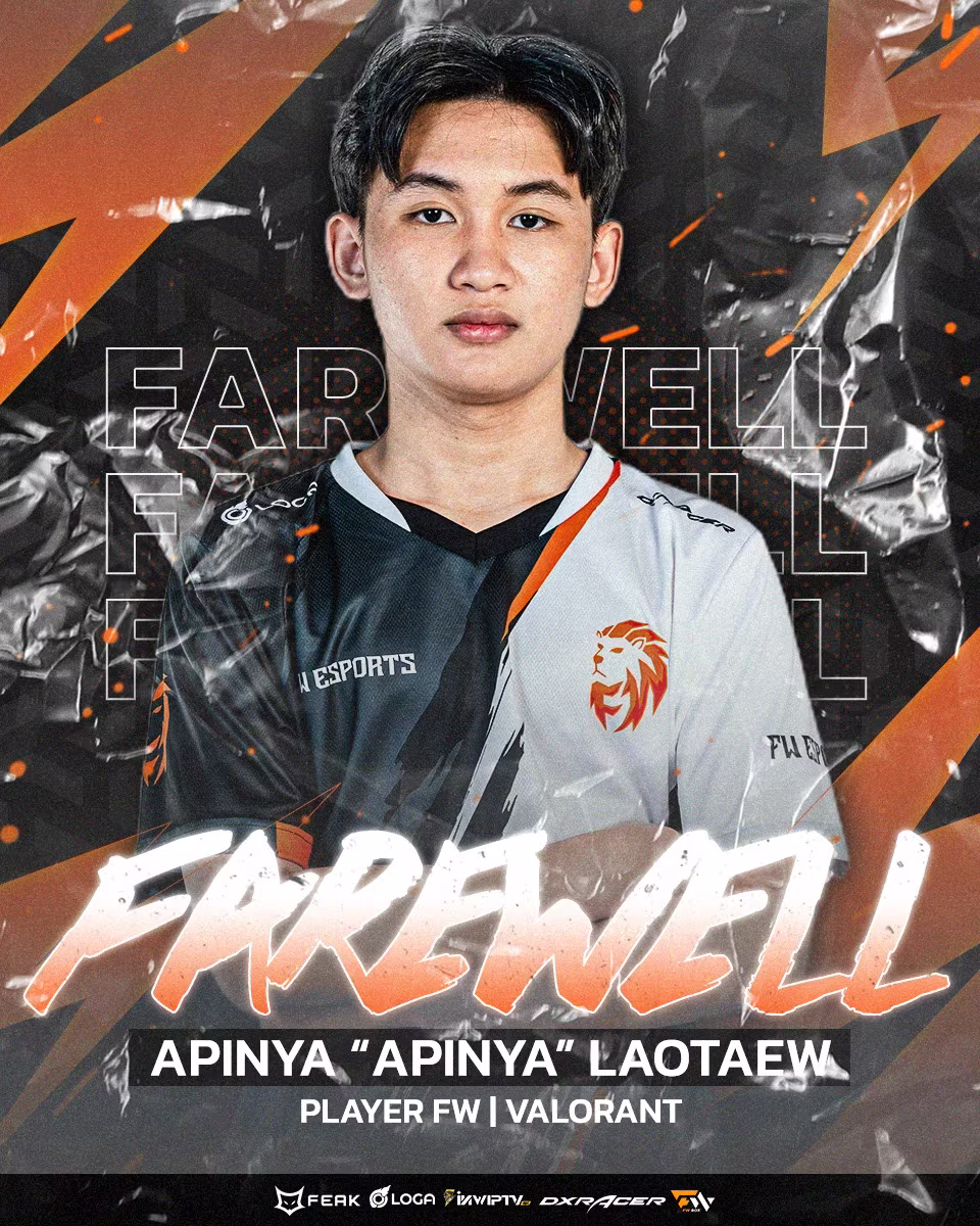 ย้อนกลับไปเมื่อวันอังคารที่ 27 กันยายนที่ผ่านมา ทางต้นสังกัดสิงโตส้ม FW Esports ได้ออกแถลงการณ์ผ่านหน้าแฟนเพจว่าตอนนี้ทางทีมและผู้เล่นตำแหน่ง Controller พ่วงด้วยบทบาท IGL อย่าง Apinya ได้แยกทางกันเป็นที่เรียบร้อย พร้อมกับมีคำอวยพรส่งท้ายให้ Apinya ได้โชคดีกับเส้นทางใหม่ที่เลือกเดิน หรือก็คือภายใต้ "ทีมใหม่" (อ่านรายละเอียดเพิ่มเติม)