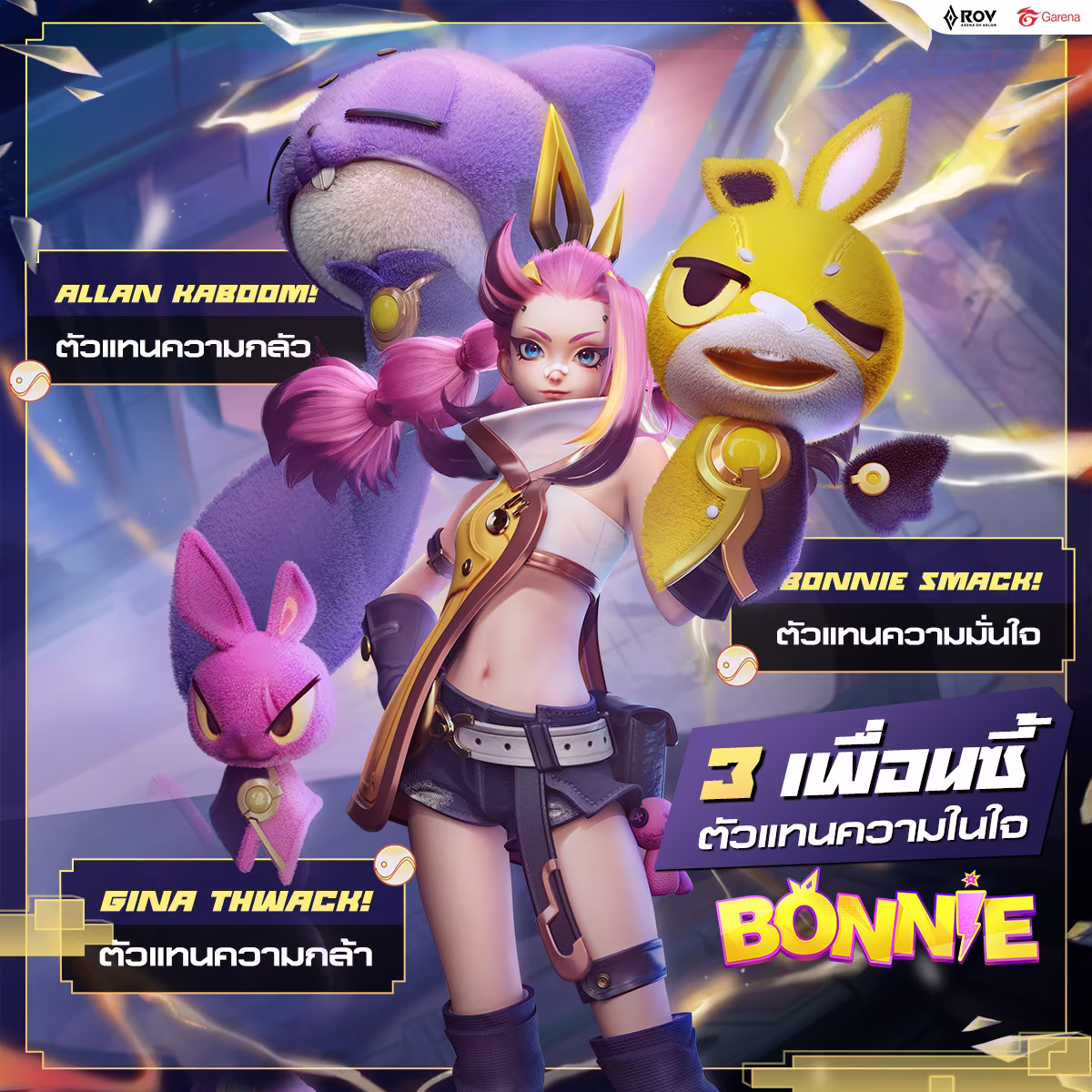 ฮีโร่ใหม่ RoV Bonnie ตอนนี้หลาย ๆ คนคงได้หน้าคร่าตาของน้องกันไปบ้างแล้ว หลังจากที่ทางแฟนเพจ Garena RoV Thailand เผยโฉมหน้าของน้องออกมาอย่างเป็นทางการแล้ว ซึ่งก็ตรงไปเป็นตามข่าวลือที่ออกมาก่อนหน้านี้เป๊ะ ๆ ครับ เพราะน้องถูกออกแบบมาในสาวน้อยสายลุยหัวชมพูตัวเล็กน่ารักสุดโมเอะพร้อมกับตุ้กตาเพื่อนรักคู่ใจอีก 3 ตัว แต่ทีนี้เรามาดูกันดีกว่าว่ามีอะไรบ้างที่เราต้องรู้เกี่ยวกับการมาของ Bonnie ฮีโร่เมจ RoV ตัวใหม่ล่าสุด