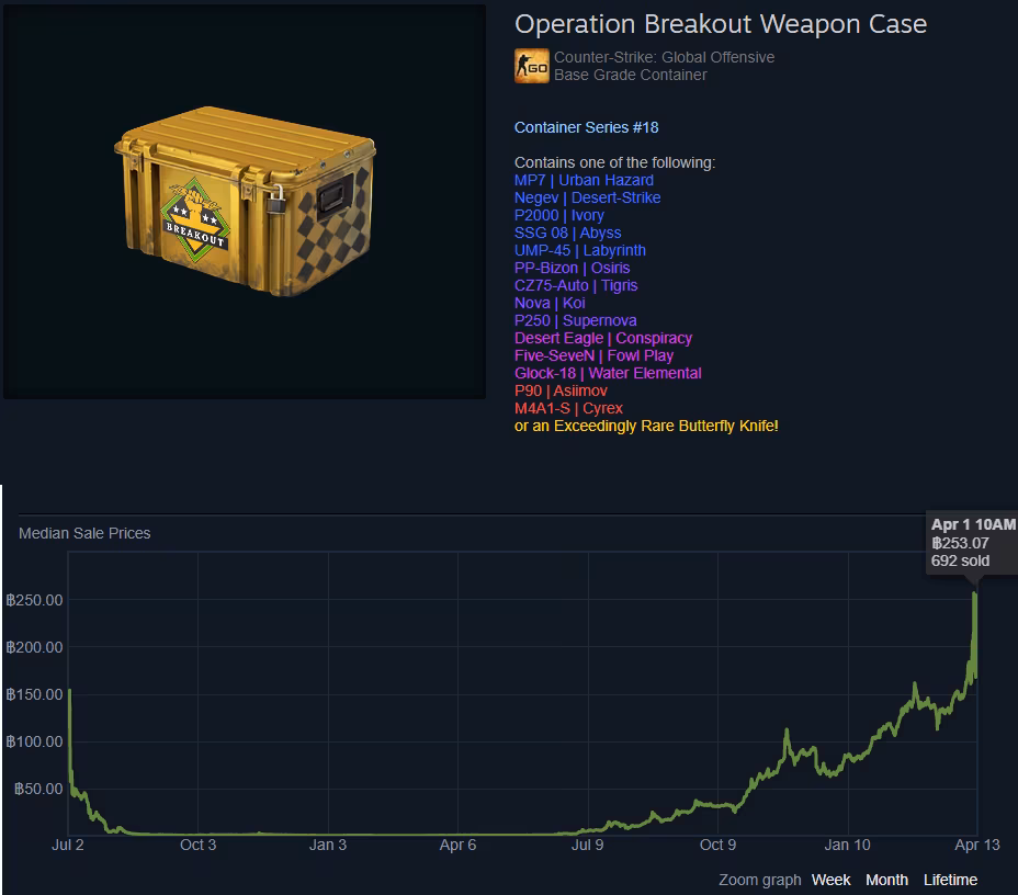 แน่นอนว่าจำนวนกล่องที่ถูกถล่มเปิดมากกว่าเดิมถึง 10 ล้าน จึงทำให้สินค้าในตลาดเริ่มจะหดหายลงไป รวมไปถึงถ้ายิ่งเป็นกล่องเก่า ๆ ก็จะมีโอกาศดรอปจากการเล่นได้ยากขึ้นไปอีก ส่งผลให้จำนวนสินค้าภายในเกม เช่น มีด , สกินปืน , ถุงมือ และ กล่อง ราคาพุ่งขึ้นสูงกว่าเดิม เช่น Operation Breakout Weapon Case โดยแต่เดิมมีราคาเพียงแค่ 2 - 10 บาท ส่วนในตอนนี้ราคาก็ได้พุ่งทะยานแตะขอบไปจนถึง 250 บาท เข้าไปแล้ว
