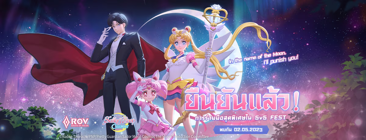 ส่วนโปรเจกต์ RoV x Sailor Moon Cosmos จะทำให้ผู้เล่นได้พบกับ 3 ตัวละครสุดโดดเด่นใน Sailor Moon Cosmos อย่าง Sailor Moon (เซเลอร์มูน), Eternal Sailor Chibi Moon (เซเลอร์มูนจิ๋ว) และพระเอกอย่างหน้ากากทักซิโด้ Tuxedo Mask พร้อมกับกิจกรรมแจกของรางวัลมากมายอีกเพียบในการคอลแลป RoV x Sailor Moon Cosmos