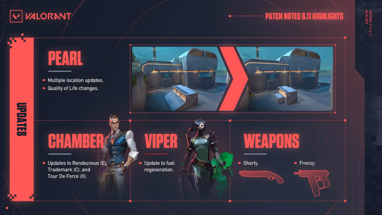หลังจากตัวเกม VALORANT พึ่งจะประกาศอัปเดตตัวเกมเวอร์ชั่น 6.11 ไปหมาด ๆ พร้อมปรับแก้ความสามารถให้แก่อดีตเอเจนท์ยอดนิยมให้น่าเล่นยิ่งขึ้น รวมไปถึงการลดกระสูนของปืนยอดฮิต Phantom และ Vandal เพื่อแก้เผ็ดผู้เล่นสายสแปมควัน โดยสามารถเข้าไปอ่านรายละเอียดเพิ่มเติมได้ในบทความนี้